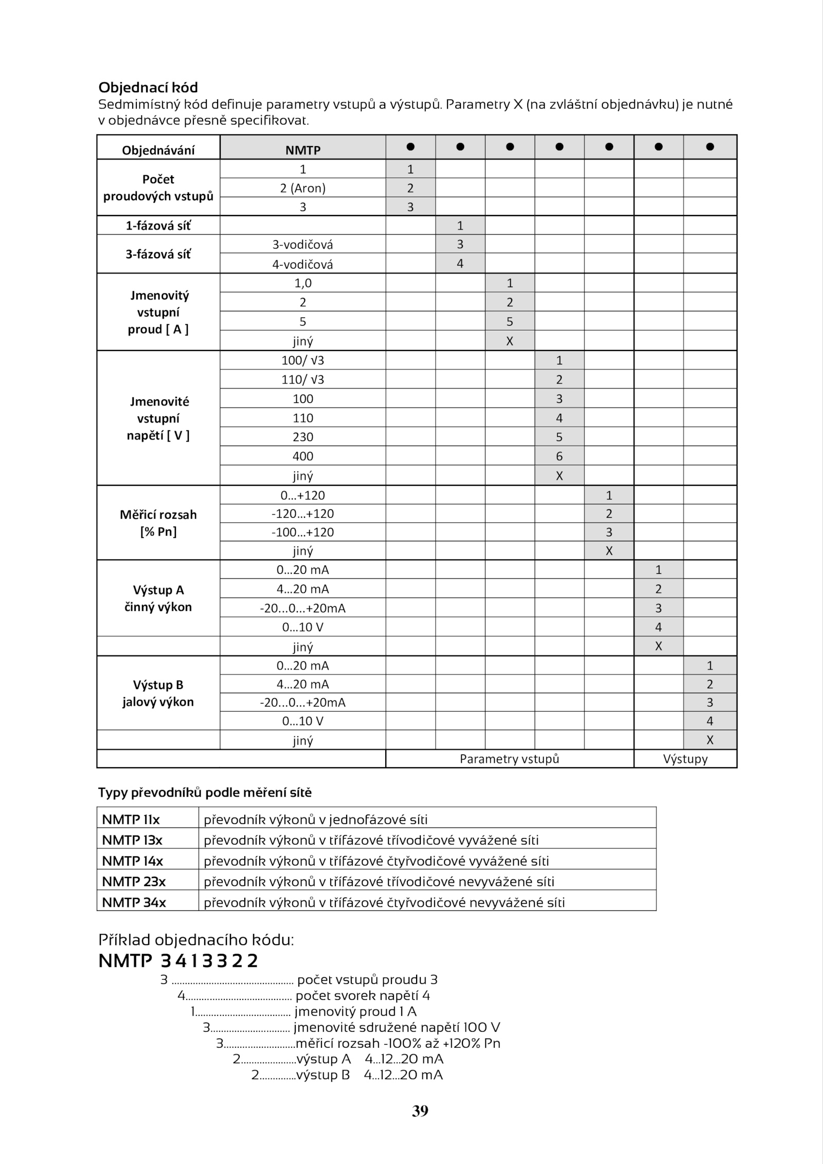 39 Objednací kód Sedmimístný kód definuje parametry vstupů výstupů. Objednávání NMTP  Počet proudových vstupů 1 1   2 (Aron) 2   3 3   1-fázová síť 1   3-fázová síť 3-vodičová  3   4-vodičová  4   Jmenovitý vstupní proud ] 1,0 1 2 2 5 5 jiný X Jmenovité vstupní napětí ] 100/ 1 110/ 2 100 3 110 4 230 5 400 6 jiný X Měřicí rozsah [% Pn] 0…+120 1 -120…+120 2 -100…+120 3 jiný X Výstup A činný výkon 0…20 1 4…20 2 -20.....výstup 4…12…20 mA 2…………. Parametry (na zvláštní objednávku) nutné v objednávce přesně specifikovat. počet svorek napětí 4 1……………………………… jmenovitý proud A 3………………………… jmenovité sdružené napětí 100 V 3………………………měřicí rozsah -100% +120% Pn 2…. počet vstupů proudu 3 4………………………………….+20mA 3 0…10 4 jiný X Parametry vstupů Výstupy Typy převodníků podle měření sítě NMTP 11x převodník výkonů jednofázové síti NMTP 13x převodník výkonů třífázové třívodičové vyvážené síti NMTP 14x převodník výkonů třífázové čtyřvodičové vyvážené síti NMTP 23x převodník výkonů třífázové třívodičové nevyvážené síti NMTP 34x převodník výkonů třífázové čtyřvodičové nevyvážené síti Příklad objednacího kódu: NMTP 2 3 ………………………………………...…………….+20mA 3 0…10 4 jiný X Výstup B jalový výkon 0…20 1 4…20 2 -20..0..výstup 4…12…20 mA ...0