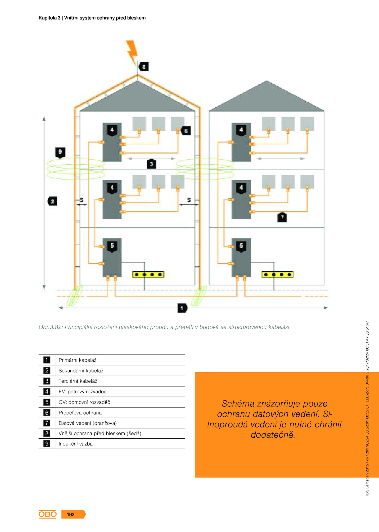 Obr. TBS Leitfaden 2015 / cs / 2017/02/24 08:52:01 08:52:01 (LLExport_04496) / 2017/02/24 08:51:47 08:51:47 192 Kapitola Vnitřní systém ochrany před bleskem .3.82: Principiální rozložení bleskového proudu přepětí budově strukturovanou kabeláží Primární kabeláž 2 Sekundární kabeláž 3 Terciární kabeláž 4 EV: patrový rozvaděč 5 GV: domovní rozvaděč 6 Přepěťová ochrana 7 Datová vedení (oranžová) 8 Vnější ochrana před bleskem (šedá) 9 Indukční vazba Schéma znázorňuje pouze ochranu datových vedení. Si- lnoproudá vedení nutné chránit dodatečně