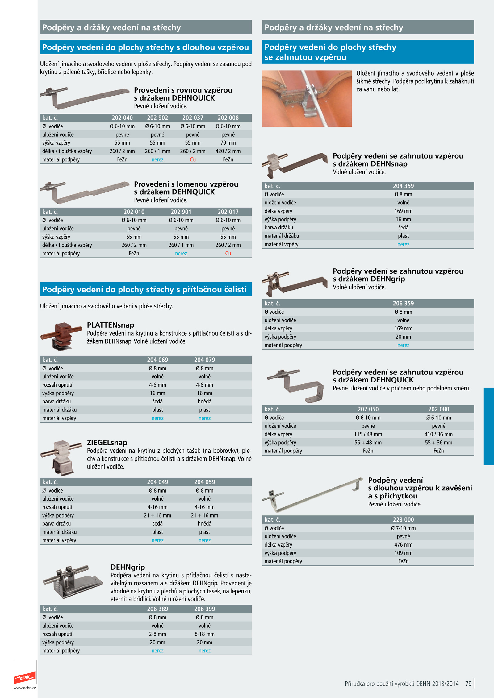 204 069 204 079 Ø vodiče mm mm uložení vodiče volné volné rozsah upnutí 4-6 mm 4-6 mm výška podpěry mm mm barva držáku šedá hnědá materiál držáku plast plast materiál vzpěry nerez nerez kat. 206 359 Ø vodiče mm uložení vodiče volné délka vzpěry 169 mm výška podpěry mm materiál podpěry nerez kat.Volné uložení vodiče. DEHNgrip Podpěra vedení krytinu přítlačnou čelistí nasta- vitelným rozsahem držákem DEHNgrip. č. Podpěry vedení zasunou pod krytinu pálené tašky, břidlice nebo lepenky. č. Provedení je vhodné krytinu plechů plochých tašek, lepenku, eternit břidlici.dehn. 204 049 204 059 Ø vodiče mm mm uložení vodiče volné volné rozsah upnutí 4-16 mm 4-16 mm výška podpěry mm mm barva držáku šedá hnědá materiál držáku plast plast materiál vzpěry nerez nerez kat. Podpěra pod krytinu zaháknutí za vanu nebo lať.www. č. č.Volné uložení vodiče. 202 010 202 901 202 017 Ø vodiče 6-10 mm 6-10 mm 6-10 mm uložení vodiče pevné pevné pevné výška vzpěry mm mm mm délka tloušťka vzpěry 260 mm 260 mm 260 mm materiál podpěry FeZn nerez Cu PLATTENsnap Podpěra vedení krytinu konstrukce přítlačnou čelistí dr- žákem DEHNsnap. č. 202 050 202 080 Ø vodiče 6-10 mm 6-10 mm uložení vodiče pevné pevné délka vzpěry 115 mm 410 mm výška podpěry mm mm materiál podpěry FeZn FeZn Provedení rovnou vzpěrou s držákem DEHNQUICK Pevné uložení vodiče. Podpěry vedení zahnutou vzpěrou s držákem DEHNsnap Volné uložení vodiče. Uložení jímacího svodového vedení ploše střechy. kat. kat. 206 389 206 399 Ø vodiče mm mm uložení vodiče volné volné rozsah upnutí 2-8 mm 8-18 mm výška podpěry mm mm materiál podpěry nerez nerez . Podpěry vedení zahnutou vzpěrou s držákem DEHNgrip Volné uložení vodiče. Podpěry vedení zahnutou vzpěrou s držákem DEHNQUICK Pevné uložení vodiče příčném nebo podélném směru. ZIEGELsnap Podpěra vedení krytinu plochých tašek (na bobrovky), ple- chy konstrukce přítlačnou čelistí držákem DEHNsnap. 202 040 202 902 202 037 202 008 Ø vodiče 6-10 mm 6-10 mm 6-10 mm 6-10 mm uložení vodiče pevné pevné pevné pevné výška vzpěry mm mm mm mm délka tloušťka vzpěry 260 mm 260 mm 260 mm 420 mm materiál podpěry FeZn nerez Cu FeZn kat. Podpěry vedení s dlouhou vzpěrou zavěšení a příchytkou Pevné uložení vodiče. 204 359 Ø vodiče mm uložení vodiče volné délka vzpěry 169 mm výška podpěry mm barva držáku šedá materiál držáku plast materiál vzpěry nerez kat. Uložení jímacího svodového vedení ploše střechy. č. č. Provedení lomenou vzpěrou s držákem DEHNQUICK Pevné uložení vodiče. kat. č. č.cz 79Příručka pro použití výrobků DEHN 2013/2014 Podpěry držáky vedení střechy Podpěry držáky vedení střechy Podpěry vedení plochy střechy dlouhou vzpěrou Podpěry vedení plochy střechy přítlačnou čelistí Podpěry vedení plochy střechy se zahnutou vzpěrou Uložení jímacího svodového vedení ploše šikmé střechy.Volné uložení vodiče. 223 000 Ø vodiče 7-10 mm uložení vodiče pevné délka vzpěry 476 mm výška podpěry 109 mm materiál podpěry FeZn kat