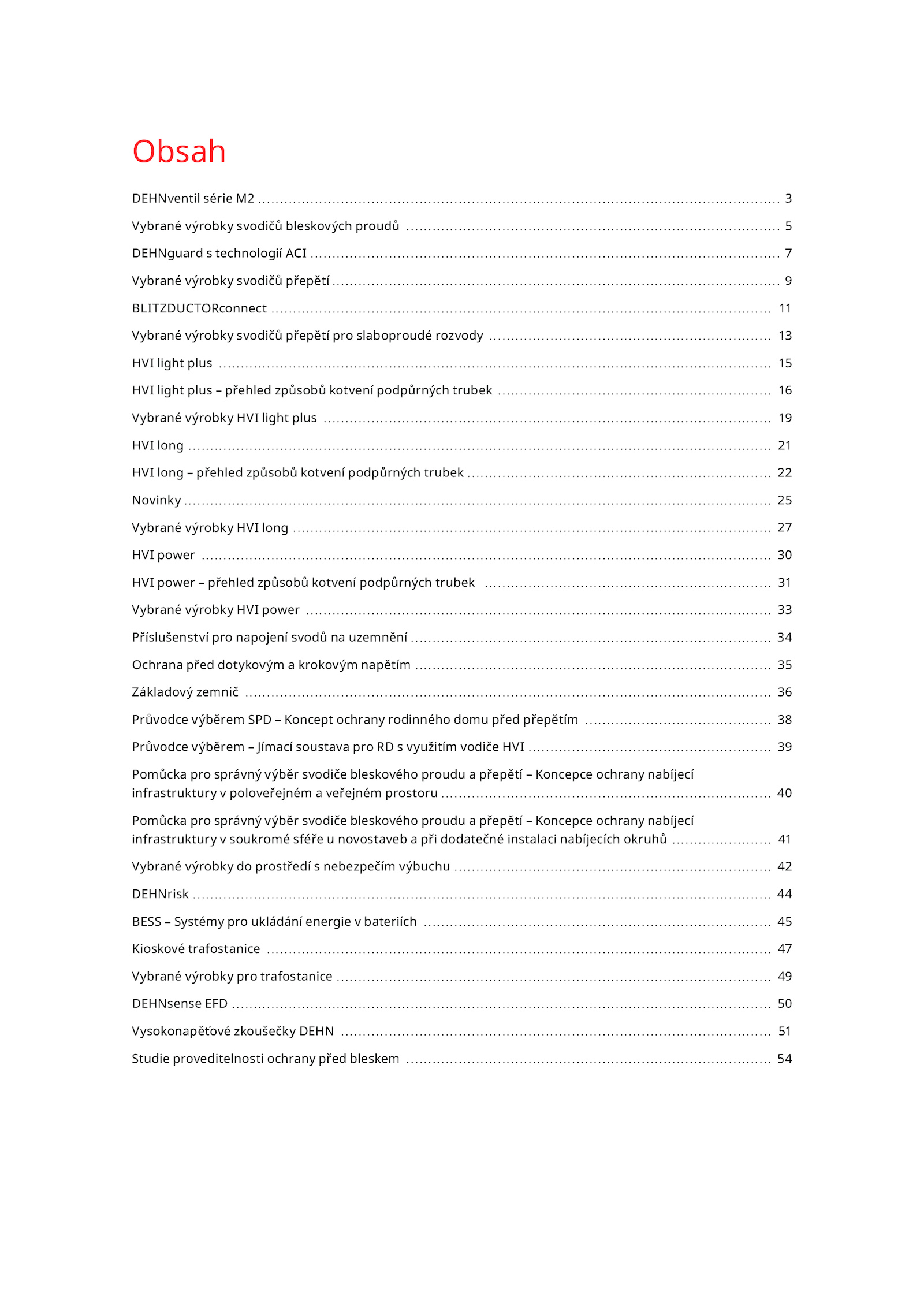 Obsah DEHNventil série 3 Vybrané výrobky svodičů bleskových proudů 5 DEHNguard technologií ACI 7 Vybrané výrobky svodičů přepětí 9 BLITZDUCTORconnect 11 Vybrané výrobky svodičů přepětí pro slaboproudé rozvody 13 HVI light plus 15 HVI light plus přehled způsobů kotvení podpůrných trubek 16 Vybrané výrobky HVI light plus 19 HVI long 21 HVI long přehled způsobů kotvení podpůrných trubek 22 Novinky� 25 Vybrané výrobky HVI long 27 HVI power 30 HVI power přehled způsobů kotvení podpůrných trubek 31 Vybrané výrobky HVI power 33 Příslušenství pro napojení svodů uzemnění� 34 Ochrana před dotykovým krokovým napětím 35 Základový zemnič 36 Průvodce výběrem SPD Koncept ochrany rodinného domu před přepětím 38 Průvodce výběrem Jímací soustava pro využitím vodiče HVI 39 Pomůcka pro správný výběr svodiče bleskového proudu přepětí Koncepce ochrany nabíjecí infrastruktury poloveřejném veřejném prostoru� 40 Pomůcka pro správný výběr svodiče bleskového proudu přepětí Koncepce ochrany nabíjecí infrastruktury soukromé sféře novostaveb při dodatečné instalaci nabíjecích okruhů 41 Vybrané výrobky prostředí nebezpečím výbuchu 42 DEHNrisk 44 BESS Systémy pro ukládání energie bateriích 45 Kioskové trafostanice 47 Vybrané výrobky pro trafostanice 49 DEHNsense EFD 50 Vysokonapěťové zkoušečky DEHN 51 Studie proveditelnosti ochrany před bleskem 54