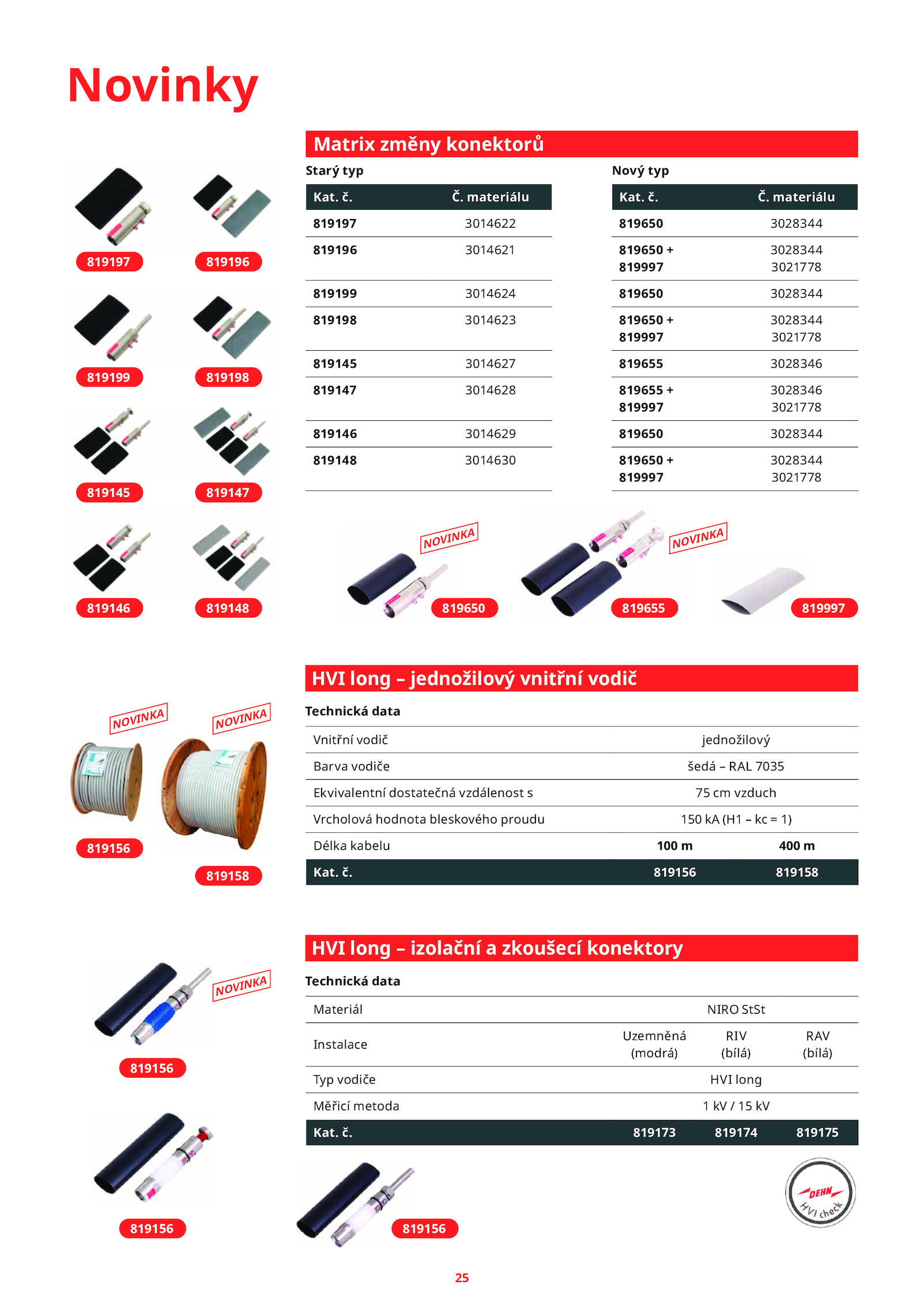 819146 819156 819148 819158 819197 819196 819199 819145 819198 819147 819650 819655 819997 NOVINKA NOVINKA NOVINKA NOVINKA HVI long jednožilový vnitřní vodič Technická data Vnitřní vodič jednožilový Barva vodiče šedá RAL 7035 Ekvivalentní dostatečná vzdálenost vzduch Vrcholová hodnota bleskového proudu 150 (H1 1) Délka kabelu 100 400 m Kat. 819156 819158 HVI long izolační zkoušecí konektory Technická data Materiál NIRO StSt Instalace Uzemněná (modrá) RIV (bílá) RAV (bílá) Typ vodiče HVI long Měřicí metoda kV Kat. 819173 819174 819175 Matrix změny konektorů Starý typ Nový typ Kat. materiálu Kat. materiálu 819197 3014622 819650 3028344 819196 3014621 819650 + 819997 3028344 3021778 819199 3014624 819650 3028344 819198 3014623 819650 + 819997 3028344 3021778 819145 3014627 819655 3028346 819147 3014628 819655 + 819997 3028346 3021778 819146 3014629 819650 3028344 819148 3014630 819650 + 819997 3028344 3021778 819156 819156 819156 NOVINKA Novinky 25
