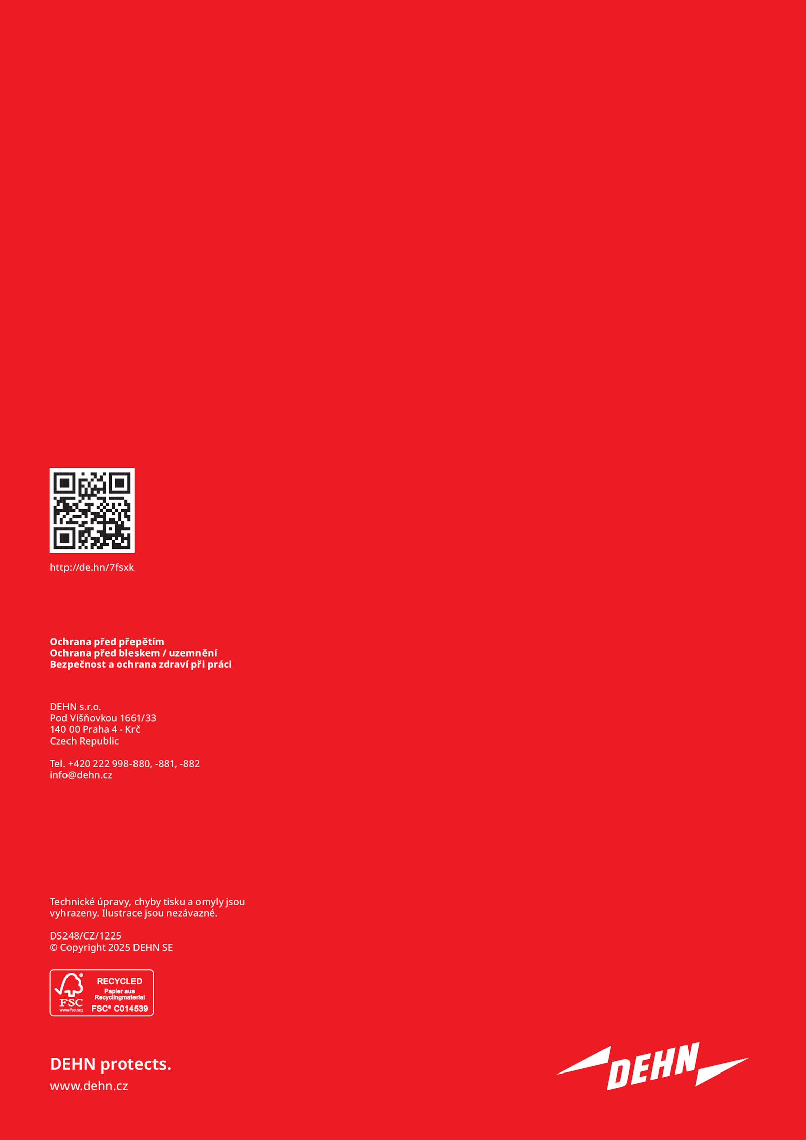 r.cz http://de. Pod Višňovkou 1661/33 140 Praha Krč Czech Republic Tel.hn/7fsxk . +420 222 998-880, -881, -882 info@dehn.dehn.cz Technické úpravy, chyby tisku omyly jsou vyhrazeny.o. www. Ilustrace jsou nezávazné. DS248/CZ/1225 © Copyright 2025 DEHN SE Ochrana před přepětím Ochrana před bleskem uzemnění Bezpečnost ochrana zdraví při práci DEHN protects.DEHN s