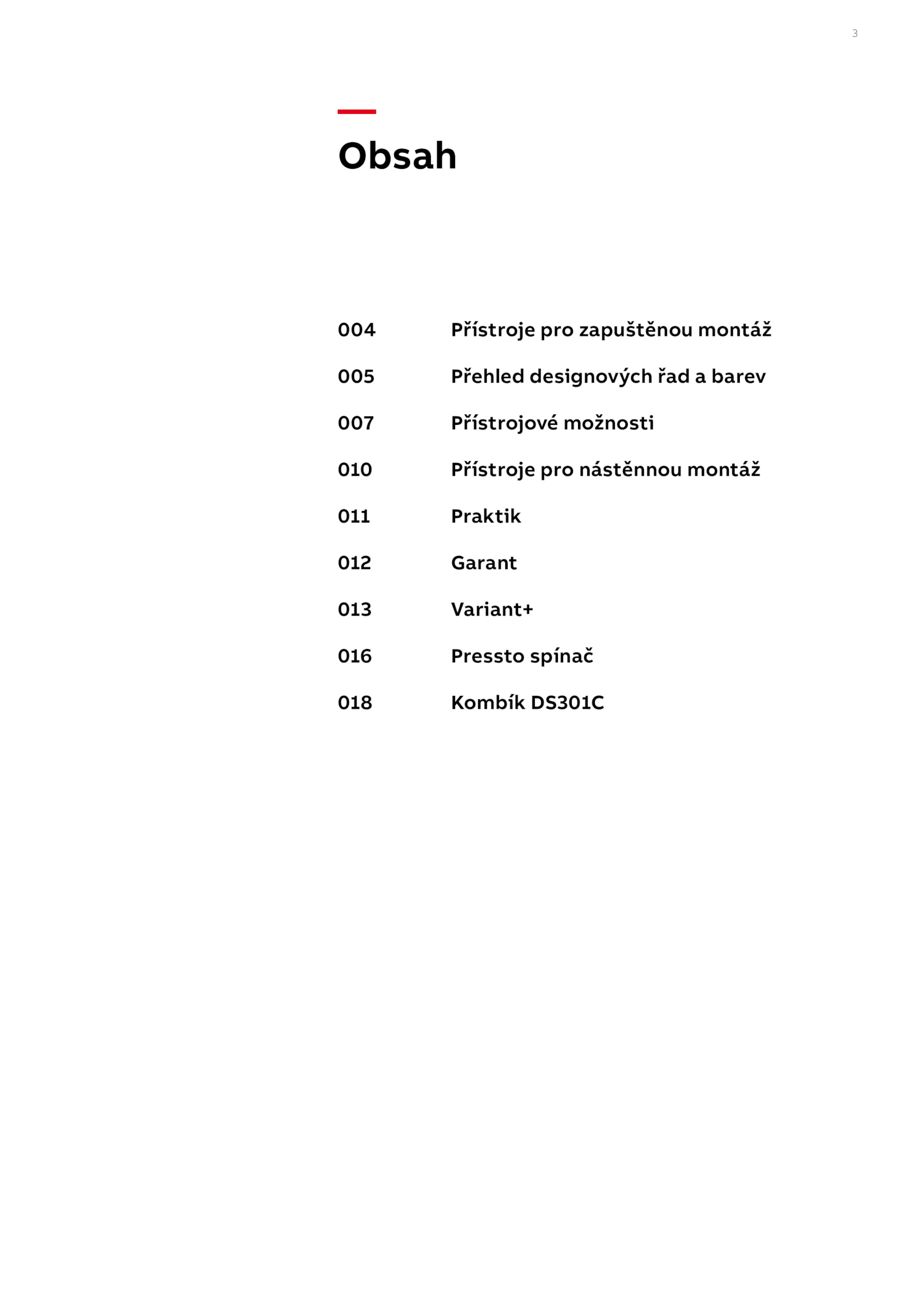 3 — Obsah 004 Přístroje pro zapuštěnou montáž 005 Přehled designových řad barev 007 Přístrojové možnosti 010 Přístroje pro nástěnnou montáž 011 Praktik 012 Garant 013 Variant+ 016 Pressto spínač 018 Kombík DS301C