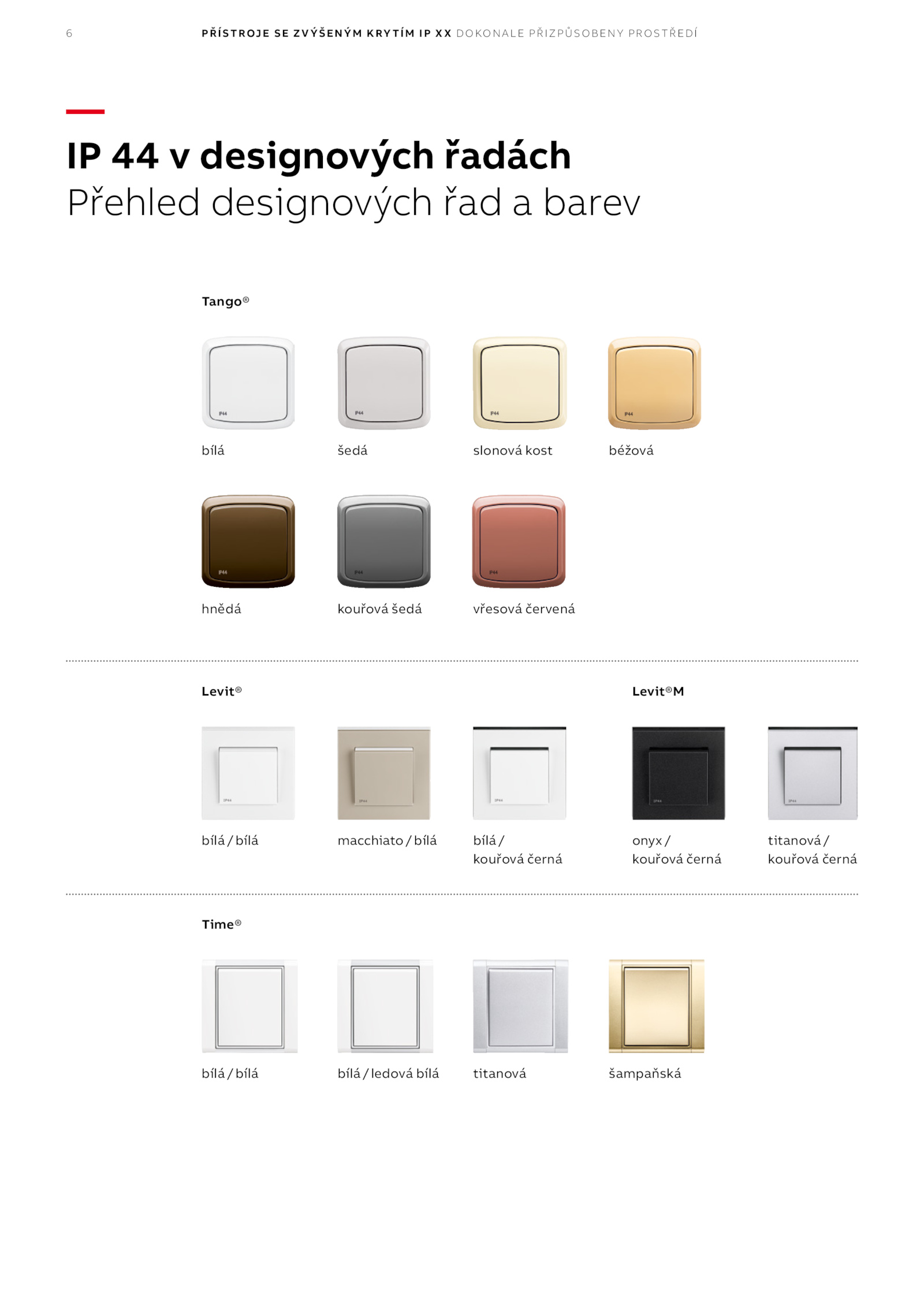 PŘÍSTROJE ÝŠENÝM KRYTÍM DOKONALE PŘIZPŮSOBENY PROSTŘEDÍ — IP designových řadách Přehled designových řad barev Time® bílá/bílá bílá/ledová bílá šampaňská titanová Levit® bílá/bílá macchiato/bílá bílá/ kouřová černá Levit®M titanová/ kouřová černá onyx/ kouřová černá Tango® bílá šedá kouřová šedá slonová kost vřesová červená béžová hnědá