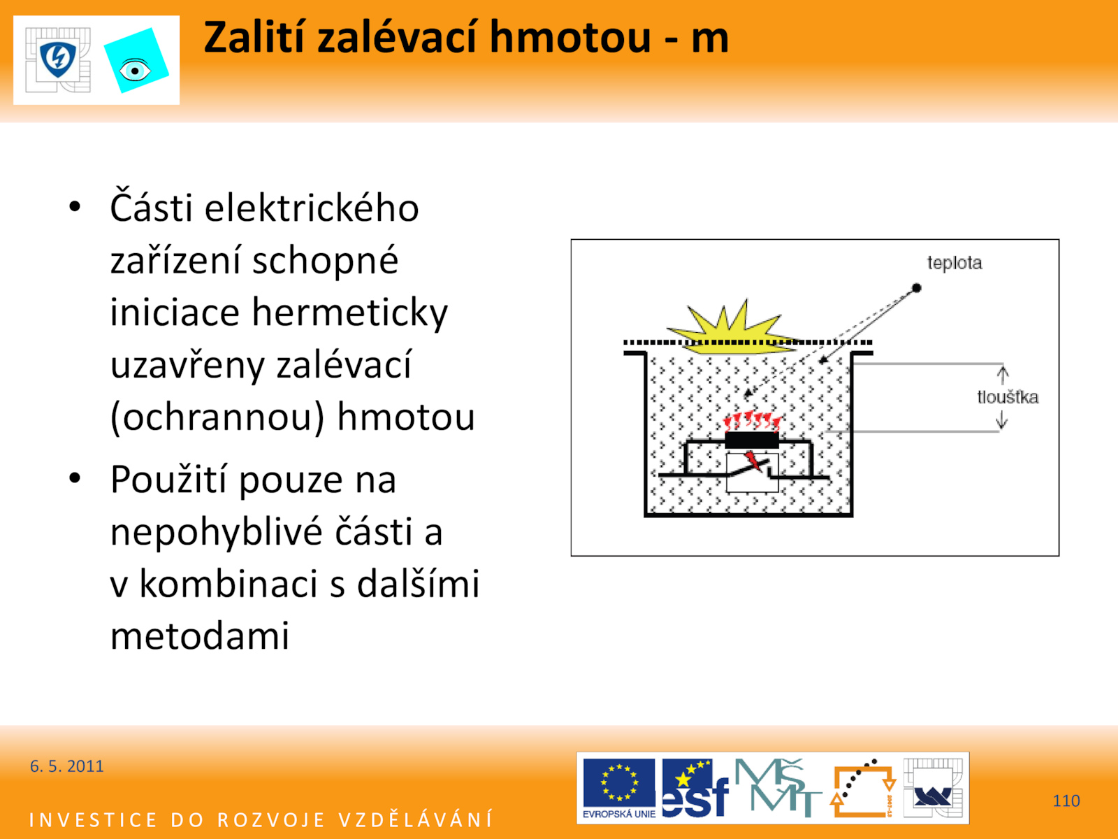 2011 .Í • Části elektrického zařízení schopné iniciace hermeticky uzavřeny zalévací (ochrannou) hmotou • Použití pouze na nepohyblivé části a v kombinaci dalšími metodami Zalití zalévací hmotou m 110 6