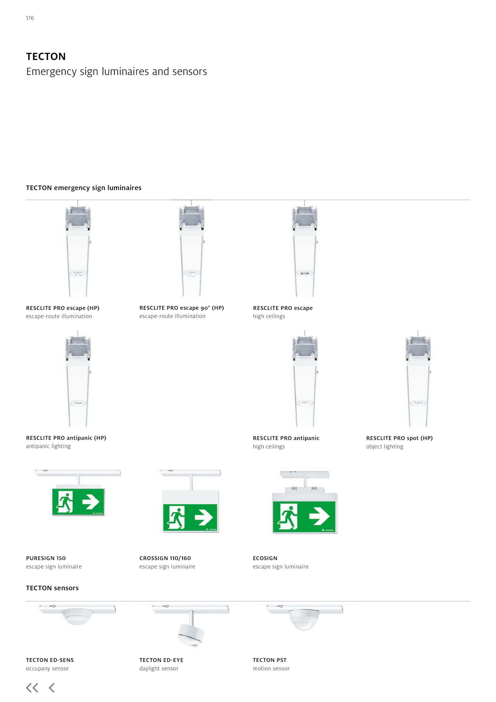 176 TECTON Emergency sign luminaires and sensors TECTON emergency sign luminaires CROSSIGN 110/160 escape sign luminaire PURESIGN 150 escape sign luminaire TECTON ED-SENS occupany sensor TECTON ED-EYE daylight sensor TECTON PST motion sensor TECTON sensors RESCLITE PRO escape 90° (HP) escape-route illumination RESCLITE PRO spot (HP) object lighting RESCLITE PRO antipanic high ceilings RESCLITE PRO escape high ceilings RESCLITE PRO escape (HP) escape-route illumination RESCLITE PRO antipanic (HP) antipanic lighting ECOSIGN escape sign luminaire