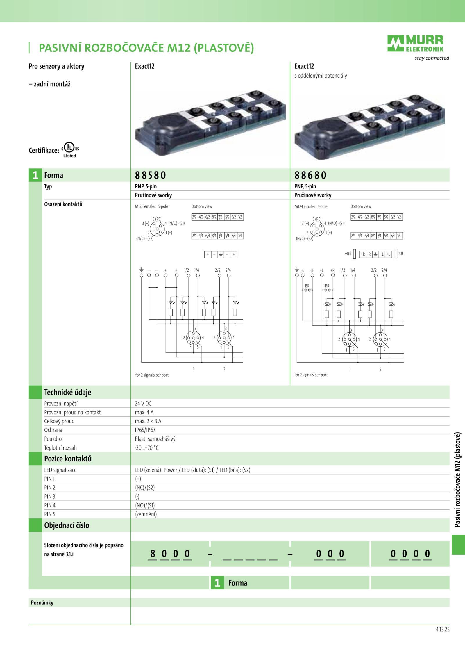 .4.i Objednací číslo Forma Typ PNP, 5-pin Pružinové svorky PNP, 5-pin Pružinové svorky Exact12 Exact12 s oddělenými potenciály LED signalizace PIN 1 PIN 2 PIN 3 PIN 4 PIN 5 LED (zelená): Power LED (žlutá): (S1) LED (bílá): (S2) (+) (NC)/(S2) (-) (NO)/(S1) (zemnění) Pozice kontaktů Provozní napětí DC Provozní proud kontakt max. A Celkový proud max.25 1 – – 8 0 1 Pasivní rozbočovače M12 (plastové) Pasivní rozbočovače M12 (plastové) Certifikace: Pro senzory aktory – zadní montáž Forma Složení objednacího čísla popsáno na straně 3. A Ochrana IP65/IP67 Pouzdro Plast, samozhášivý Teplotní rozsah -20.1.13..+70 °C Technické údaje Osazení kontaktů for signals per port 5 5 3 3 2 2 1 1 4 4 1 2 1/2 1/4 + 2/2 2/4 2/2 4/2 6/2 8/2 7/2 5/2 3/2 1/2 2/4 4/4 6/4 8/4 7/4 5/4 3/4 1/4 + + – M12-Females 5-pole Bottom view 4 (N/O)-(S1) 3 (–) 1 (+) 5 (PE) 2 (N/C) (S2) for signals per port +R +L –L M12-Females 5-pole 5 5 3 3 2 2 1 1 4 4 1 2 1/2 1/4 +L -L 2/2 2/4 -BR +BR Bottom view -BR +BR 4 (N/O)-(S1) 3 (–) 1 (+) 5 (PE) 2 (N/C) (S2) 2/2 4/2 6/2 8/2 7/2 5/2 3/2 1/2 2/4 4/4 6/4 8/4 7/4 5/4 3/4 1/4 Poznámky 88580 88680