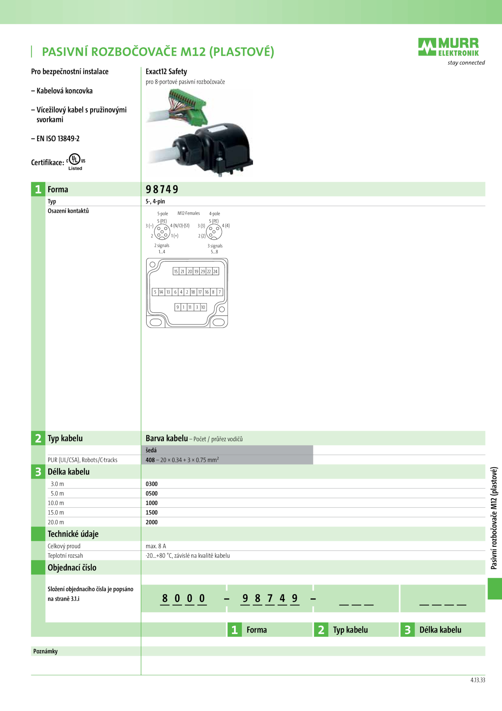 33 1 3 – – 8 9 1 3 2 Pasivní rozbočovače M12 (plastové) Pasivní rozbočovače M12 (plastové) Certifikace: Pro bezpečnostní instalace – Kabelová koncovka – Vícežilový kabel pružinovými svorkami – ISO 13849-2 Forma Typ kabelu Délka kabelu Složení objednacího čísla popsáno na straně 3.75 mm² Typ kabelu Barva kabelu– Počet průřez vodičů Osazení kontaktů 1..4 5.13..0 m 15.0 m 10.1.4..i Objednací číslo Forma Typ 5-, 4-pin Exact12 Safety pro 8-portové pasivní rozbočovače Celkový proud max. A Teplotní rozsah -20.0 m 0300 0500 1000 1500 2000 Délka kabelu PUR (UL/CSA), Robots/C-tracks šedá 408 0..8 15 24 13 5 7 8 9 10 3 4 (N/O)-(S1) 3 (–) 1 (+) 5 (PE) 2 4 (4) 3 (3) 5 (PE) 2 (2) M12-Females 5-pole 4-pole 2 signals signals Poznámky 98749 .0 m 5.0 m 20.34 0...+80 °C, závislé kvalitě kabelu Technické údaje 3
