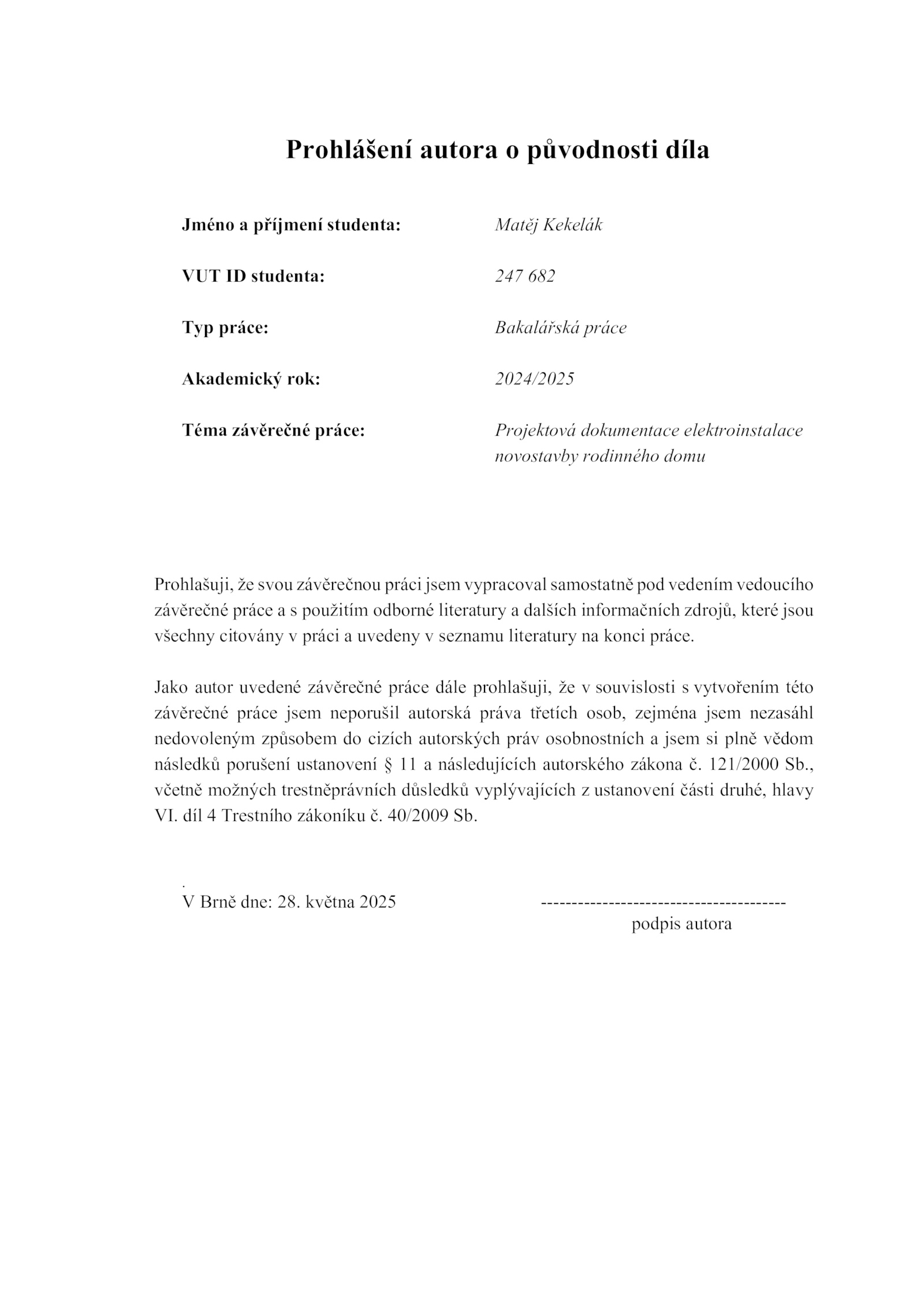 Téma závěrečné práce: Projektová dokumentace elektroinstalace