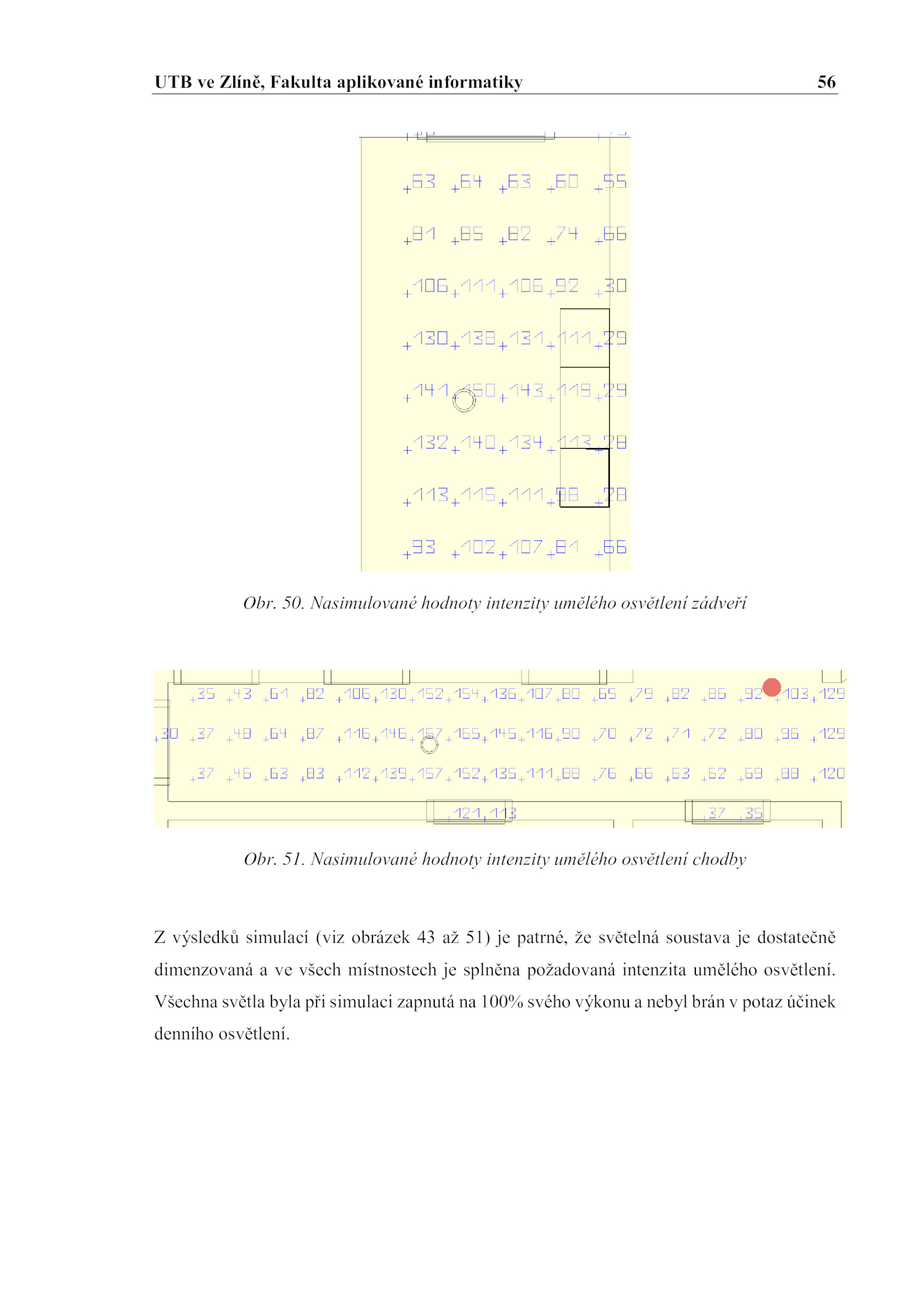 Všechna světla byla při simulaci zapnutá 100% svého výkonu nebyl brán potaz účinek denního osvětlení. Nasimulované hodnoty intenzity umělého osvětlení zádveří Obr. 51. Nasimulované hodnoty intenzity umělého osvětlení chodby Z výsledků simulací (viz obrázek 51) patrné, světelná soustava dostatečně dimenzovaná všech místnostech splněna požadovaná intenzita umělého osvětlení. .UTB Zlíně, Fakulta aplikované informatiky 56 Obr. 50