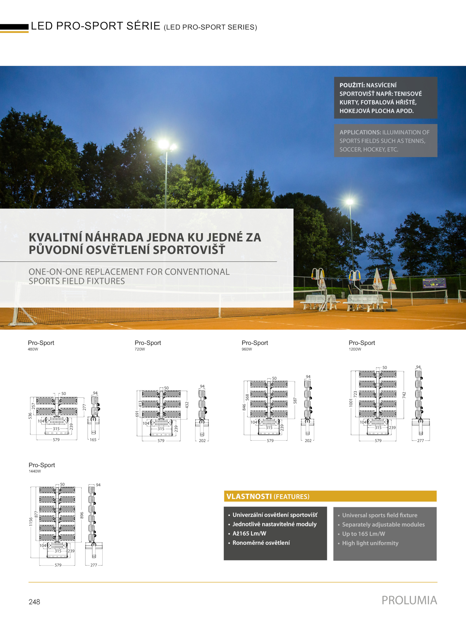 APPLICATIONS: ILLUMINATION OF SPORTS FIELDS SUCH TENNIS, SOCCER, HOCKEY, ETC.PROLUMIA 248 LED PRO-SPORT SÉRIE (LED PRO-SPORT SERIES) POUŽITÍ: NASVÍCENÍ SPORTOVIŠŤ NAPŘ: TENISOVÉ KURTY, FOTBALOVÁ HŘIŠTĚ, HOKEJOVÁ PLOCHA APOD. • Univerzální osvětlení sportovišť • Jednotlivě nastavitelné moduly • Až165 Lm/W • Ronoměrné osvětlení • Universal sports field fixture • Separately adjustable modules • 165 Lm/W • High light uniformity VLASTNOSTI (FEATURES) Pro-Sport 480W Pro-Sport 720W Pro-Sport 960W Pro-Sport 1200W Pro-Sport 1440W 165 94 50 579 239 315 104 277 536 257 202 94 50 579 239 315 104 432 691 413 94 202 50 579 239 315 104 587 846 568 94 277 50 579 239 315 104 742 1001 723 896 50 94 277 579 239 315 104 1156 877 KVALITNÍ NÁHRADA JEDNA JEDNÉ ZA PŮVODNÍ OSVĚTLENÍ SPORTOVIŠŤ ONE-ON-ONE REPLACEMENT FOR CONVENTIONAL SPORTS FIELD FIXTURES