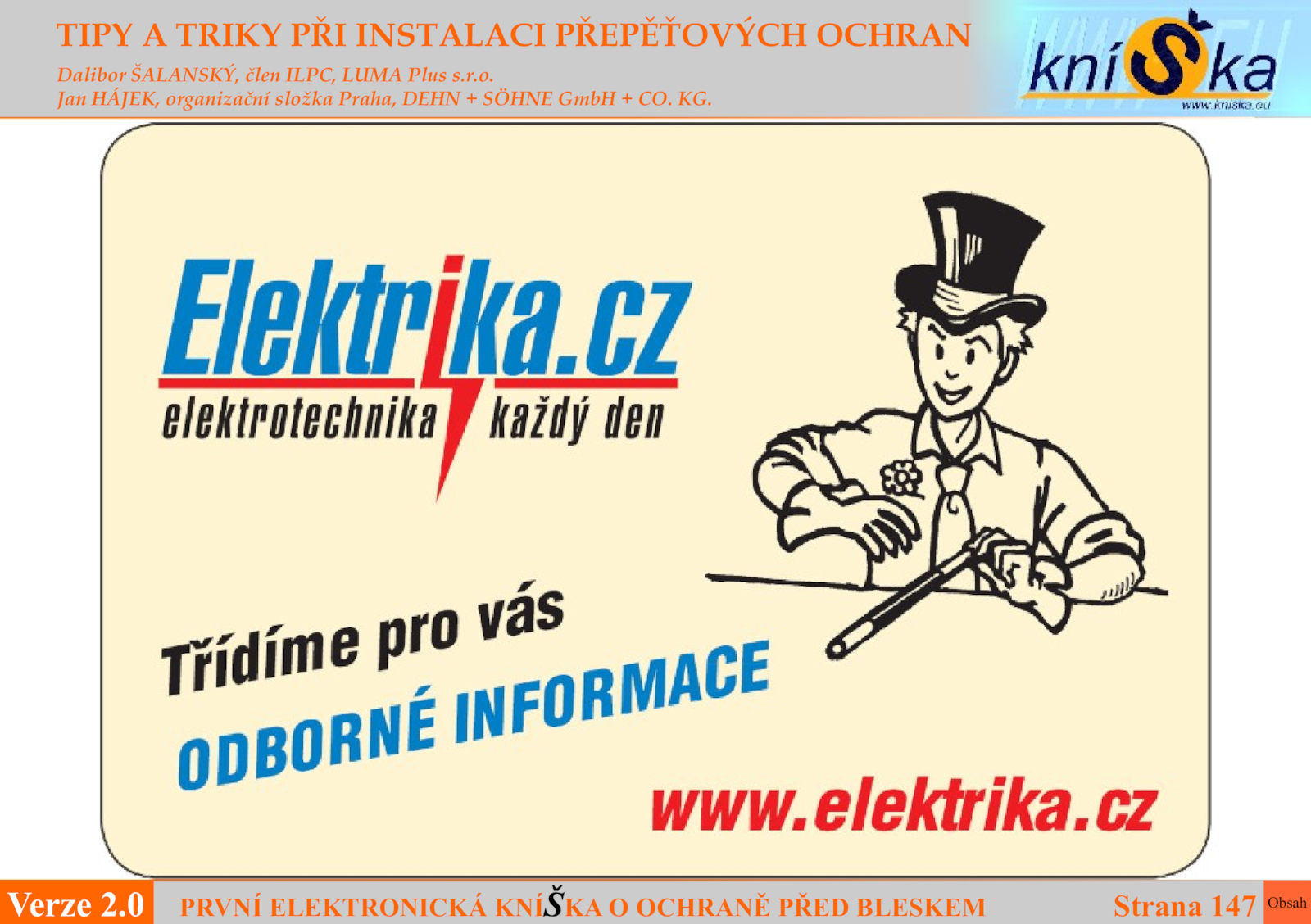 Jan HÁJEK, organizační složka Praha, DEHN SÖHNE GmbH CO.PRVNÍ ELEKTRONICKÁ KNÍ OCHRANĚ PŘED BLESKEM Š Strana 147 Verze 2.r.o.0 TIPY TRIKY PŘI INSTALACI PŘEPĚŤOVÝCH OCHRAN Dalibor ŠALANSKÝ, člen ILPC, LUMA Plus s. KG. Obsah