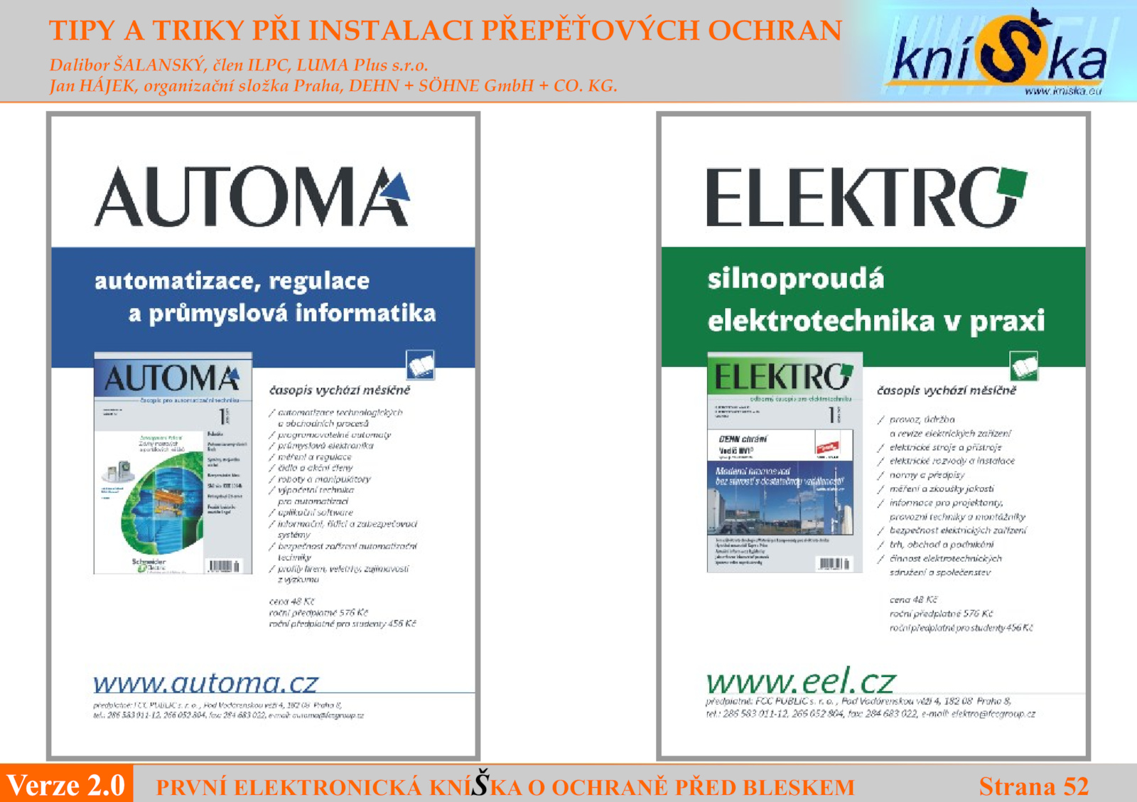 TIPY TRIKY PŘI INSTALACI PŘEPĚŤOVÝCH OCHRAN Dalibor ŠALANSKÝ, člen ILPC, LUMA Plus s. KG. PRVNÍ ELEKTRONICKÁ KNÍ OCHRANĚ PŘED BLESKEM Š Strana 52 Verze 2. Jan HÁJEK, organizační složka Praha, DEHN SÖHNE GmbH CO.o.0 .r