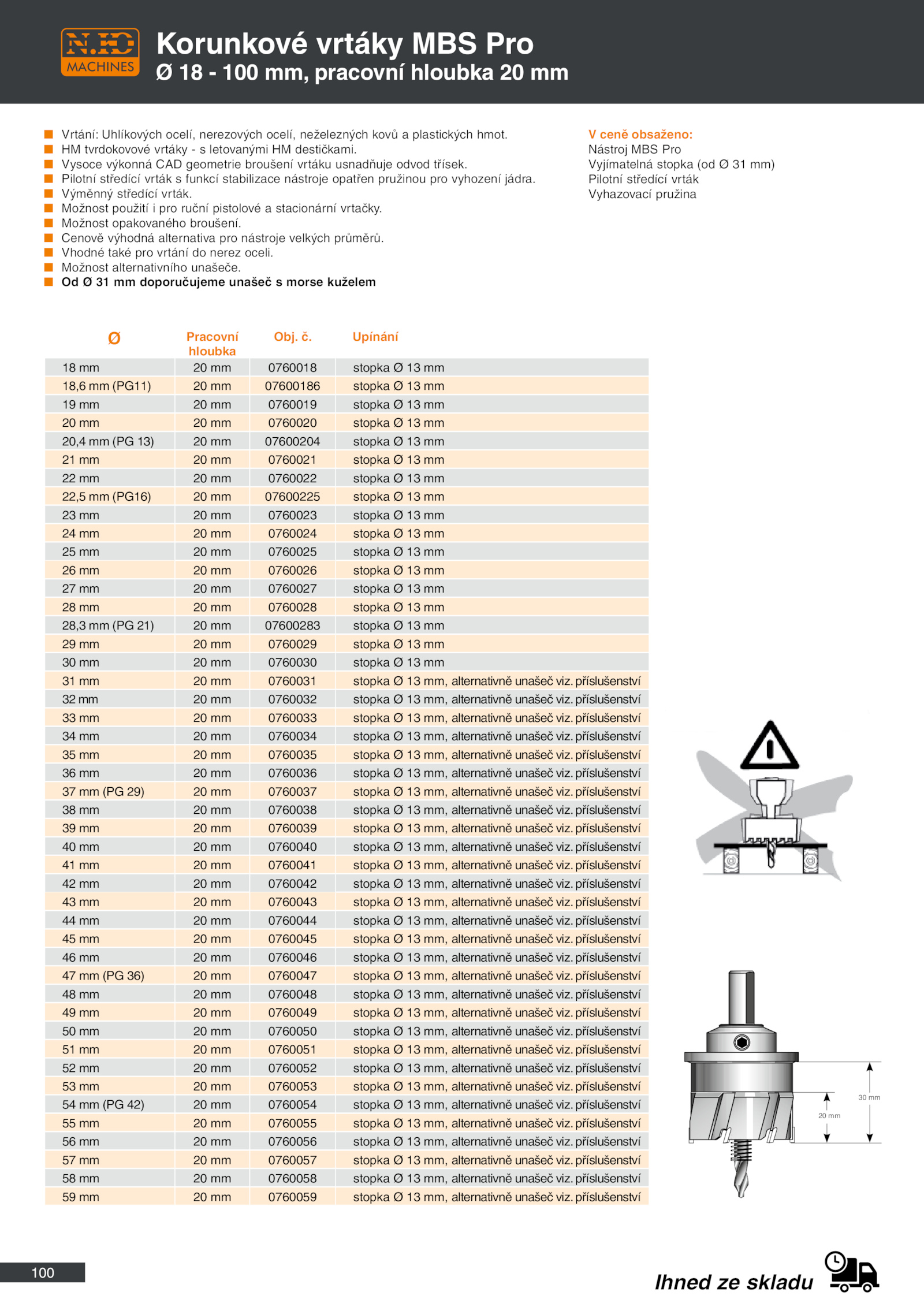 ■ Pilotní středící vrták funkcí stabilizace nástroje opatřen pružinou pro vyhození jádra. příslušenství