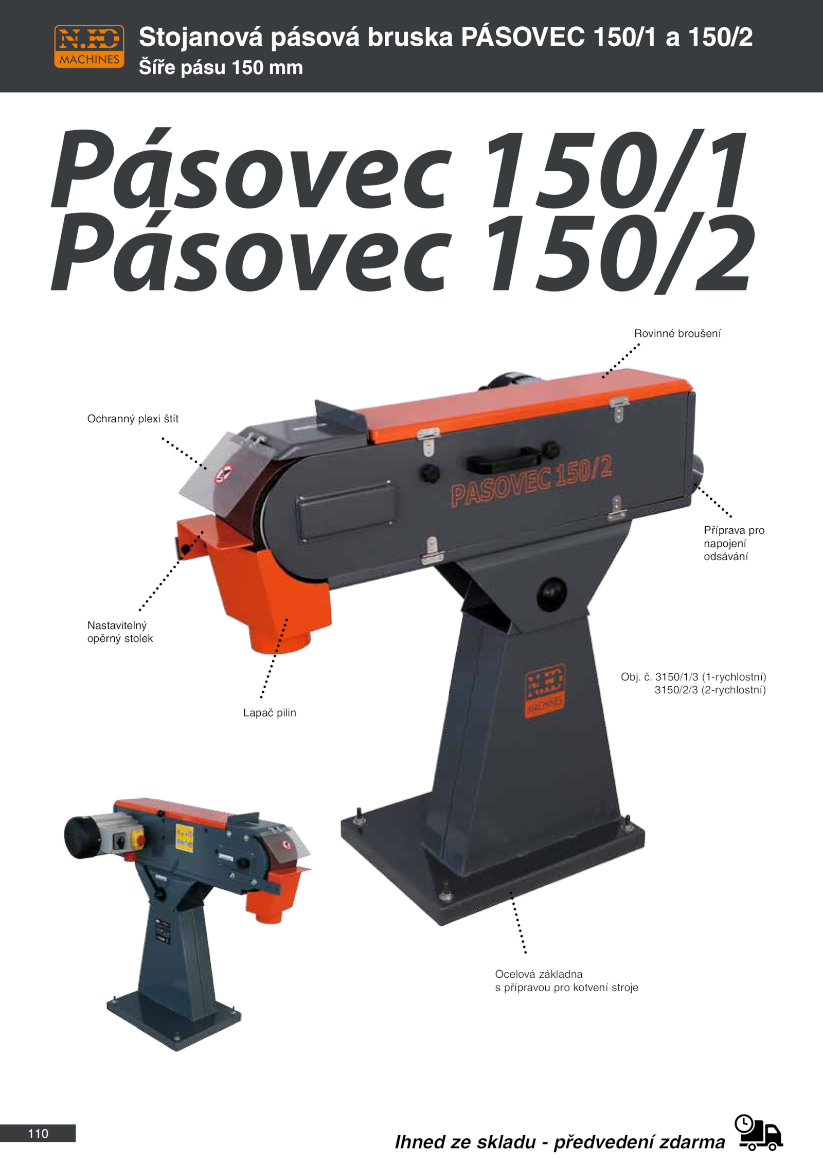 3150/1/3 (1-rychlostní) 3150/2/3 (2-rychlostní) Ihned skladu předvedení zdarma Lapač pilin Ochranný plexi štít Rovinné broušení Příprava pro napojení odsávání Ocelová základna s přípravou pro kotvení stroje Nastavitelný opěrný stolek .110 Stojanová pásová bruska Pásovec 150/1 150/2 Šíře pásu 150 mm Pásovec 150/1 Pásovec 150/2 Obj