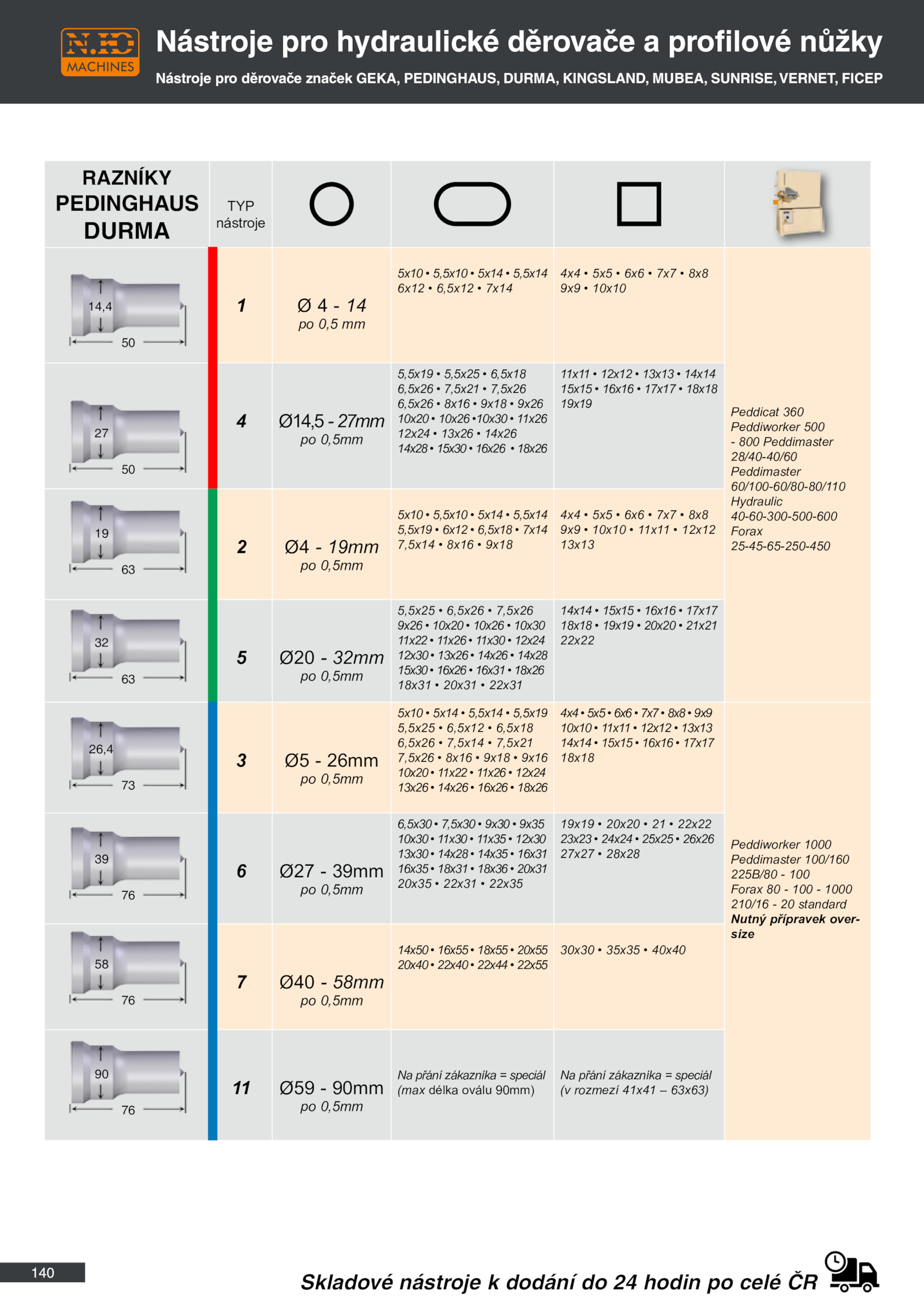 Nástroje pro děrovače značek GEKA, PEDINGHAUS, DURMA, KINGSLAND, MUBEA, SUNRISE, VERNET, FICEP