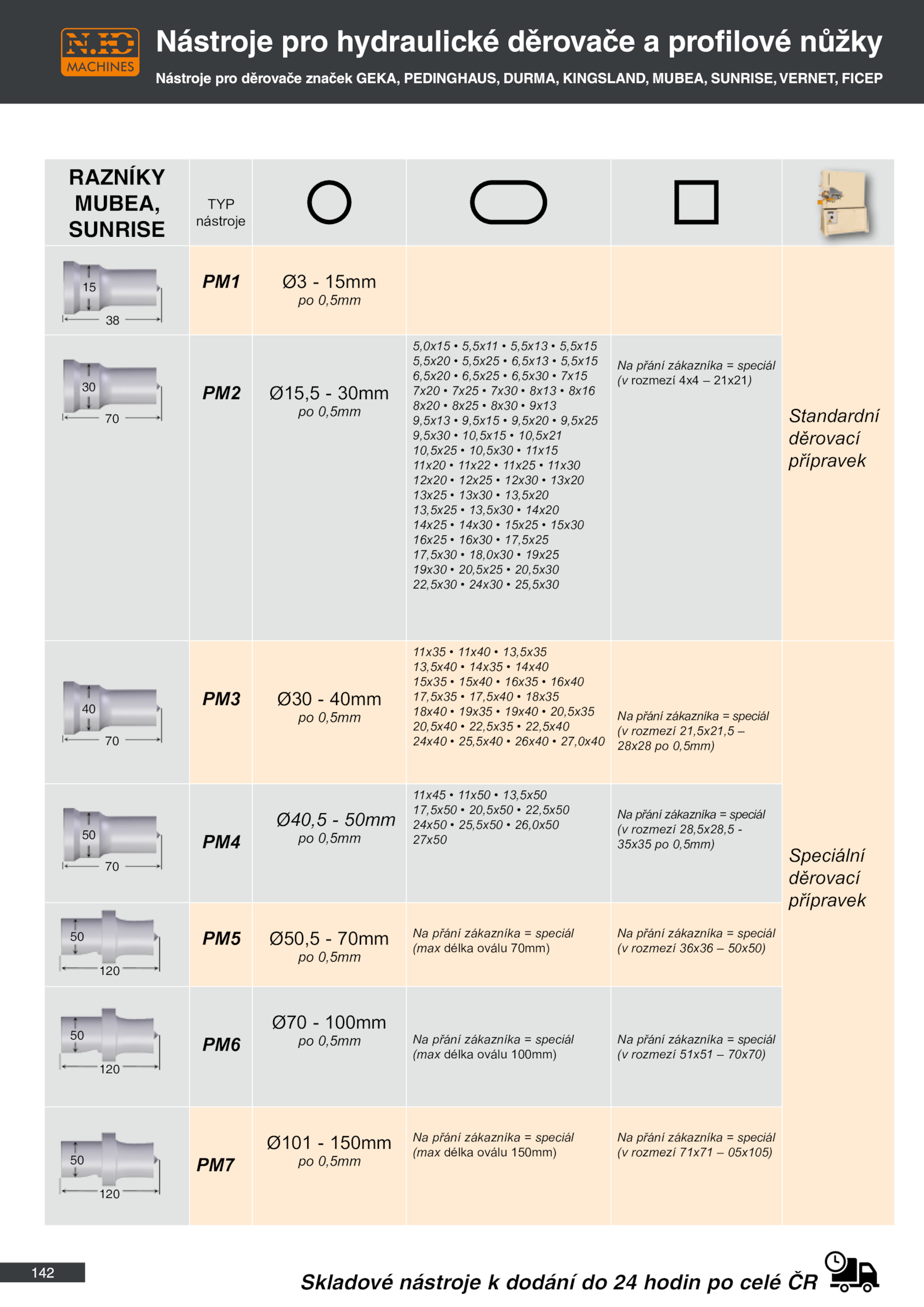 Nástroje pro děrovače značek GEKA, PEDINGHAUS, DURMA, KINGSLAND, MUBEA, SUNRISE, VERNET, FICEP