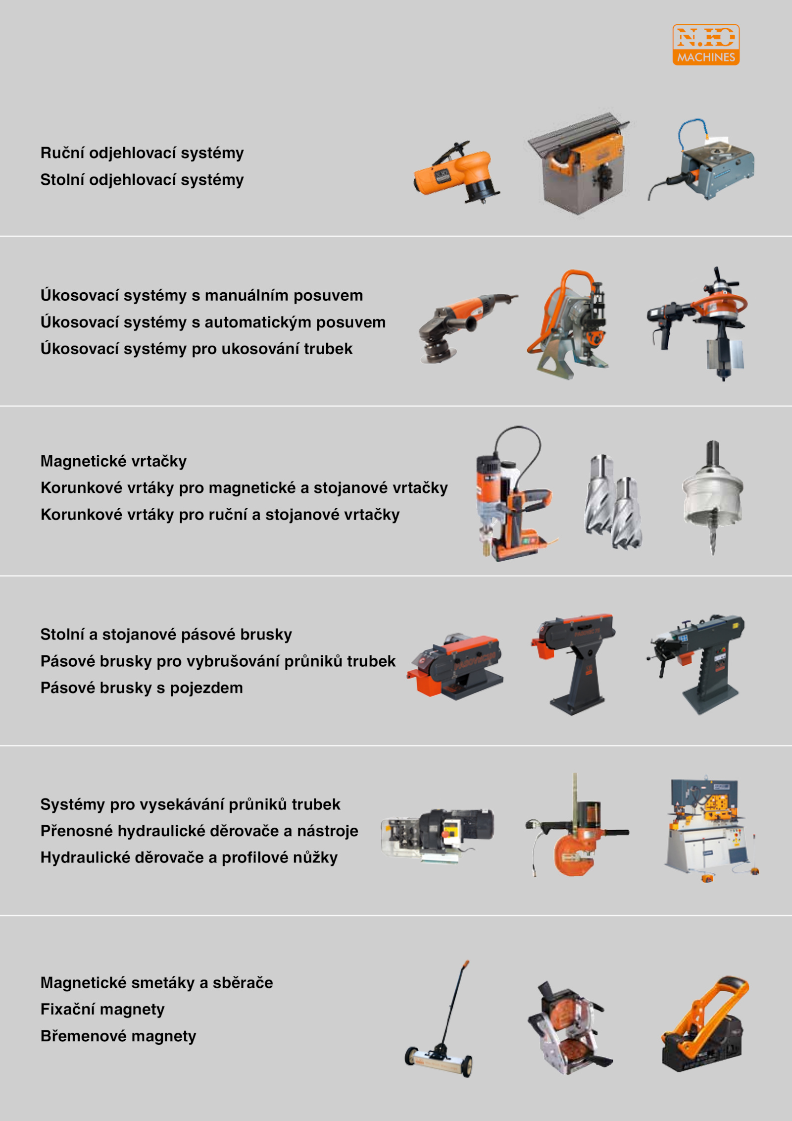 1 Ruční odjehlovací systémy Stolní odjehlovací systémy Úkosovací systémy manuálním posuvem Úkosovací systémy automatickým posuvem Úkosovací systémy pro ukosování trubek Magnetické vrtačky Korunkové vrtáky pro magnetické stojanové vrtačky Korunkové vrtáky pro ruční stojanové vrtačky Systémy pro vysekávání průniků trubek Přenosné hydraulické děrovače nástroje Hydraulické děrovače profilové nůžky Stolní stojanové pásové brusky Pásové brusky pro vybrušování průniků trubek Pásové brusky pojezdem Magnetické smetáky sběrače Fixační magnety Břemenové magnety