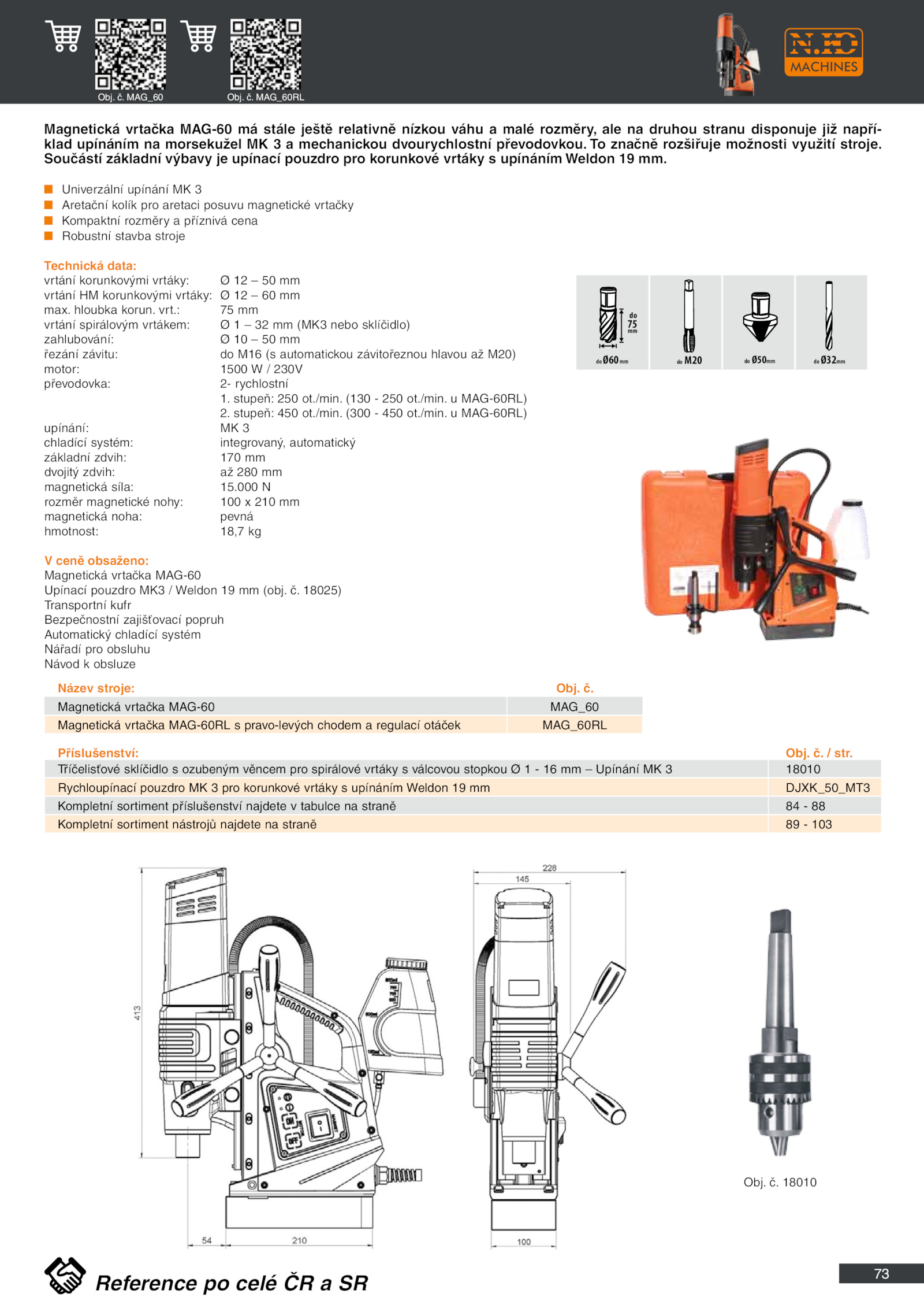 /min. stupeň: 250 ot. Magnetická vrtačka MAG-60 MAG_60 Magnetická vrtačka MAG-60RL pravo-levých chodem regulací otáček MAG_60RL Magnetická vrtačka MAG-60 stále ještě relativně nízkou váhu malé rozměry, ale druhou stranu disponuje již napří- klad upínáním morsekužel mechanickou dvourychlostní převodovkou. 18010 Obj. (300 450 ot. značně rozšiřuje možnosti využití stroje./min. ■ Univerzální upínání 3 ■ Aretační kolík pro aretaci posuvu magnetické vrtačky ■ Kompaktní rozměry příznivá cena ■ Robustní stavba stroje Technická data: vrtání korunkovými vrtáky: mm vrtání korunkovými vrtáky: mm max./min. Tříčelisťové sklíčidlo ozubeným věncem pro spirálové vrtáky válcovou stopkou Upínání 18010 Rychloupínací pouzdro pro korunkové vrtáky upínáním Weldon DJXK_50_MT3 Kompletní sortiment příslušenství najdete tabulce straně 88 Kompletní sortiment nástrojů najdete straně 103 do 75 mm do Ø60mm M20 Ø50mm Ø32mm Obj. stupeň: 450 ot. vrt. (130 250 ot. hloubka korun./min.000 N rozměr magnetické nohy: 100 210 mm magnetická noha: pevná hmotnost: 18,7 kg V ceně obsaženo: Magnetická vrtačka MAG-60 Upínací pouzdro MK3 Weldon (obj. Součástí základní výbavy upínací pouzdro pro korunkové vrtáky upínáním Weldon mm. 18025) Transportní kufr Bezpečnostní zajišťovací popruh Automatický chladící systém Nářadí pro obsluhu Návod obsluze Příslušenství: Obj.73 Název stroje: Obj.: mm vrtání spirálovým vrtákem: (MK3 nebo sklíčidlo) zahlubování: mm řezání závitu: M16 automatickou závitořeznou hlavou M20) motor: 1500 230V převodovka: rychlostní 1. MAG_60RL Reference celé SR . MAG_60 Obj. č. str. MAG-60RL) 2. MAG-60RL) upínání: 3 chladící systém: integrovaný, automatický základní zdvih: 170 mm dvojitý zdvih: 280 mm magnetická síla: 15