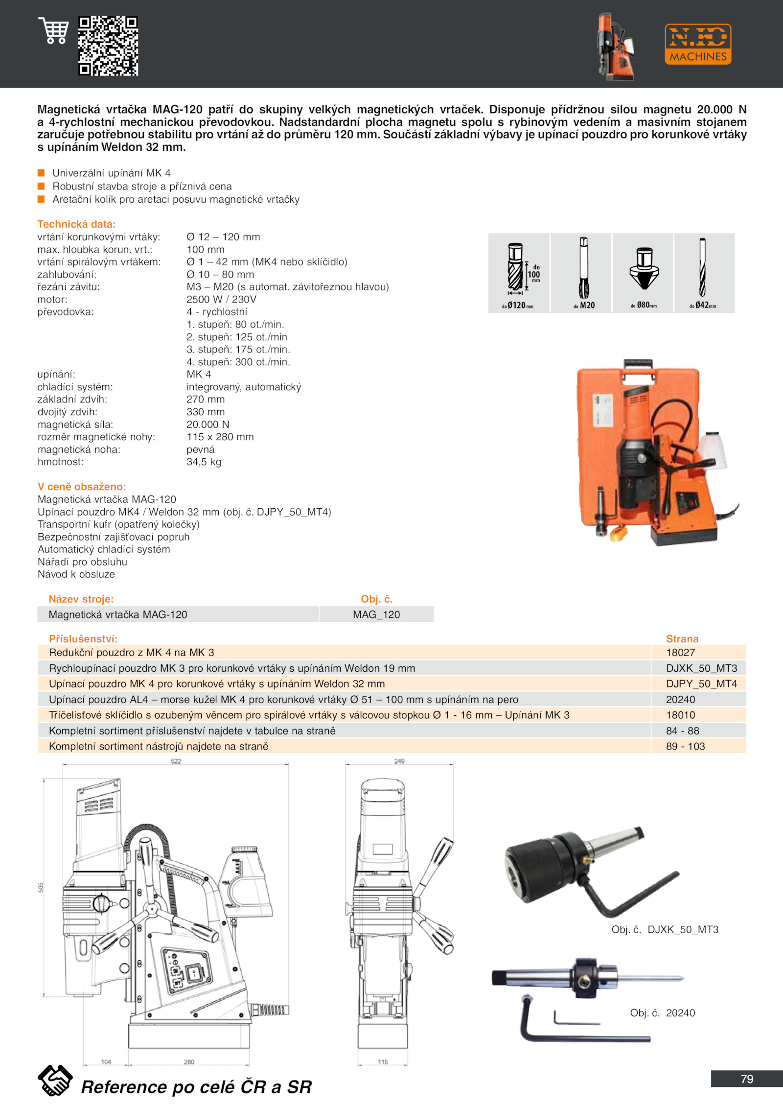 /min. č. Nadstandardní plocha magnetu spolu rybinovým vedením masivním stojanem zaručuje potřebnou stabilitu pro vrtání průměru 120 mm. závitořeznou hlavou) motor: 2500 230V převodovka: rychlostní 1. Disponuje přídržnou silou magnetu 20. ■ Univerzální upínání 4 ■ Robustní stavba stroje příznivá cena ■ Aretační kolík pro aretaci posuvu magnetické vrtačky Technická data: vrtání korunkovými vrtáky: 120 mm max.: 100 mm vrtání spirálovým vrtákem: (MK4 nebo sklíčidlo) zahlubování: mm řezání závitu: M20 automat. hloubka korun./min. upínání: 4 chladící systém: integrovaný, automatický základní zdvih: 270 mm dvojitý zdvih: 330 mm magnetická síla: 20./min. Součástí základní výbavy upínací pouzdro pro korunkové vrtáky s upínáním Weldon mm.000 N a 4-rychlostní mechanickou převodovkou.000 N rozměr magnetické nohy: 115 280 mm magnetická noha: pevná hmotnost: 34,5 kg V ceně obsaženo: Magnetická vrtačka MAG-120 Upínací pouzdro MK4 Weldon (obj. DJXK_50_MT3 Obj. stupeň: 125 ot. 20240 do 100 mm do Ø120mm M20 Ø80mm Ø42mm . Magnetická vrtačka MAG-120 MAG_120 Magnetická vrtačka MAG-120 patří skupiny velkých magnetických vrtaček. 4. 2.79 Název stroje: Obj. vrt. stupeň: 300 ot. stupeň: 175 ot./min 3. DJPY_50_MT4) Transportní kufr (opatřený kolečky) Bezpečnostní zajišťovací popruh Automatický chladící systém Nářadí pro obsluhu Návod obsluze Příslušenství: Strana Redukční pouzdro 18027 Rychloupínací pouzdro pro korunkové vrtáky upínáním Weldon DJXK_50_MT3 Upínací pouzdro pro korunkové vrtáky upínáním Weldon DJPY_50_MT4 Upínací pouzdro AL4 morse kužel pro korunkové vrtáky 100 upínáním pero 20240 Tříčelisťové sklíčidlo ozubeným věncem pro spirálové vrtáky válcovou stopkou Upínání 18010 Kompletní sortiment příslušenství najdete tabulce straně 88 Kompletní sortiment nástrojů najdete straně 103 Reference celé SR Obj. stupeň: ot