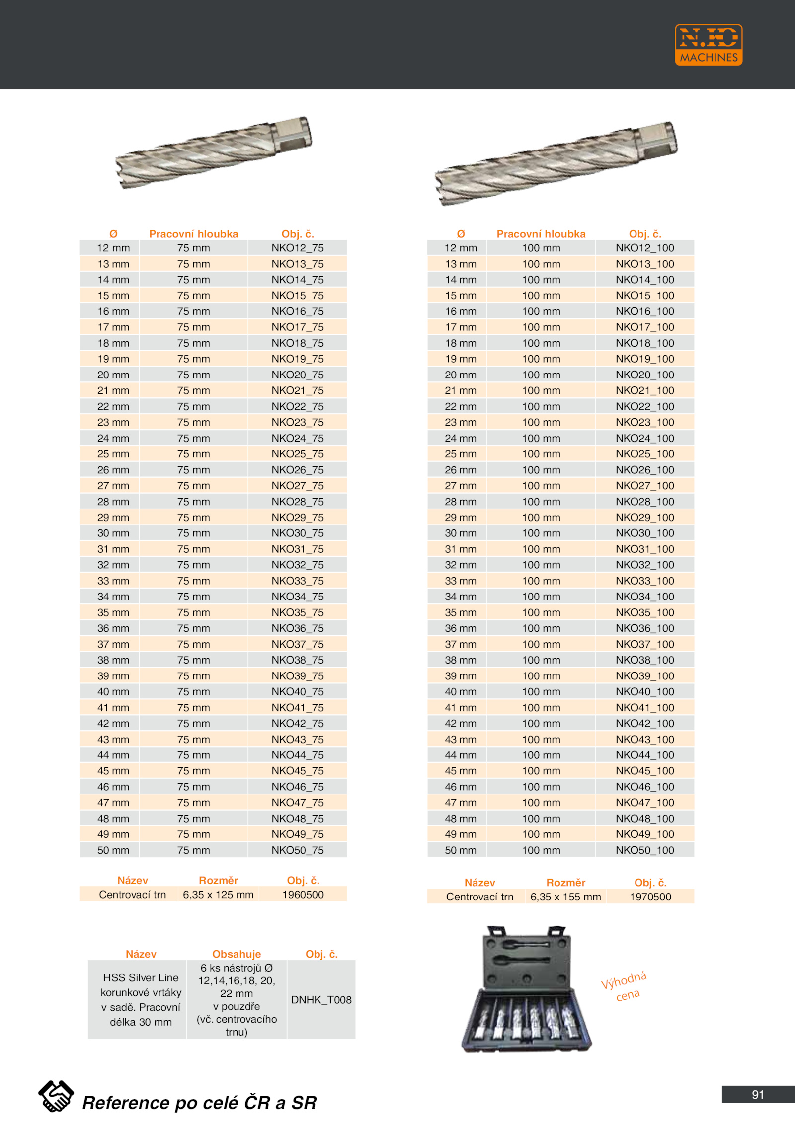 č.91 Ø Pracovní hloubka Obj. č. č. Centrovací trn 6,35 155 1970500 Výhodná cena Reference celé SR . č. centrovacího trnu) DNHK_T008 Název Rozměr Obj. 12 100 NKO12_100 13 100 NKO13_100 14 100 NKO14_100 15 100 NKO15_100 16 100 NKO16_100 17 100 NKO17_100 18 100 NKO18_100 19 100 NKO19_100 20 100 NKO20_100 21 100 NKO21_100 22 100 NKO22_100 23 100 NKO23_100 24 100 NKO24_100 25 100 NKO25_100 26 100 NKO26_100 27 100 NKO27_100 28 100 NKO28_100 29 100 NKO29_100 30 100 NKO30_100 31 100 NKO31_100 32 100 NKO32_100 33 100 NKO33_100 34 100 NKO34_100 35 100 NKO35_100 36 100 NKO36_100 37 100 NKO37_100 38 100 NKO38_100 39 100 NKO39_100 40 100 NKO40_100 41 100 NKO41_100 42 100 NKO42_100 43 100 NKO43_100 44 100 NKO44_100 45 100 NKO45_100 46 100 NKO46_100 47 100 NKO47_100 48 100 NKO48_100 49 100 NKO49_100 50 100 NKO50_100 Název Rozměr Obj. HSS Silver Line korunkové vrtáky v sadě. č. Pracovní délka mm 6 nástrojů Ø 12,14,16,18, 20, 22 mm v pouzdře (vč. Centrovací trn 6,35 125 1960500 Název Obsahuje Obj. 12 NKO12_75 13 NKO13_75 14 NKO14_75 15 NKO15_75 16 NKO16_75 17 NKO17_75 18 NKO18_75 19 NKO19_75 20 NKO20_75 21 NKO21_75 22 NKO22_75 23 NKO23_75 24 NKO24_75 25 NKO25_75 26 NKO26_75 27 NKO27_75 28 NKO28_75 29 NKO29_75 30 NKO30_75 31 NKO31_75 32 NKO32_75 33 NKO33_75 34 NKO34_75 35 NKO35_75 36 NKO36_75 37 NKO37_75 38 NKO38_75 39 NKO39_75 40 NKO40_75 41 NKO41_75 42 NKO42_75 43 NKO43_75 44 NKO44_75 45 NKO45_75 46 NKO46_75 47 NKO47_75 48 NKO48_75 49 NKO49_75 50 NKO50_75 Ø Pracovní hloubka Obj
