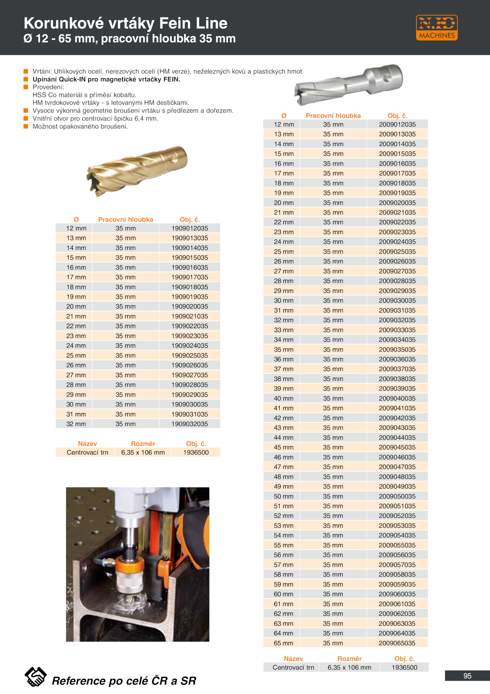 12 2009012035 13 2009013035 14 2009014035 15 2009015035 16 2009016035 17 2009017035 18 2009018035 19 2009019035 20 2009020035 21 2009021035 22 2009022035 23 2009023035 24 2009024035 25 2009025035 26 2009026035 27 2009027035 28 2009028035 29 2009029035 30 2009030035 31 2009031035 32 2009032035 33 2009033035 34 2009034035 35 2009035035 36 2009036035 37 2009037035 38 2009038035 39 2009039035 40 2009040035 41 2009041035 42 2009042035 43 2009043035 44 2009044035 45 2009045035 46 2009046035 47 2009047035 48 2009048035 49 2009049035 50 2009050035 51 2009051035 52 2009052035 53 2009053035 54 2009054035 55 2009055035 56 2009056035 57 2009057035 58 2009058035 59 2009059035 60 2009060035 61 2009061035 62 2009062035 63 2009063035 64 2009064035 65 2009065035 Reference celé SR . č.95 Název Rozměr Obj. 12 1909012035 13 1909013035 14 1909014035 15 1909015035 16 1909016035 17 1909017035 18 1909018035 19 1909019035 20 1909020035 21 1909021035 22 1909022035 23 1909023035 24 1909024035 25 1909025035 26 1909026035 27 1909027035 28 1909028035 29 1909029035 30 1909030035 31 1909031035 32 1909032035 Ø Pracovní hloubka Obj. ■ Upínání Quick-IN pro magnetické vrtačky FEIN. č. ■ Vysoce výkonná geometrie broušení vrtáku předřezem dořezem. Centrovací trn 6,35 106 1936500 Korunkové vrtáky Fein Line Ø mm, pracovní hloubka mm ■ Vrtání: Uhlíkových ocelí, nerezových ocelí (HM verze), neželezných kovů plastických hmot. Centrovací trn 6,35 106 1936500 Název Rozměr Obj. ■ Provedení: HSS materiál příměsí kobaltu. ■ Vnitřní otvor pro centrovací špičku 6,4 mm. č. č. HM tvrdokovové vrtáky letovanými destičkami. ■ Možnost opakovaného broušení. Ø Pracovní hloubka Obj