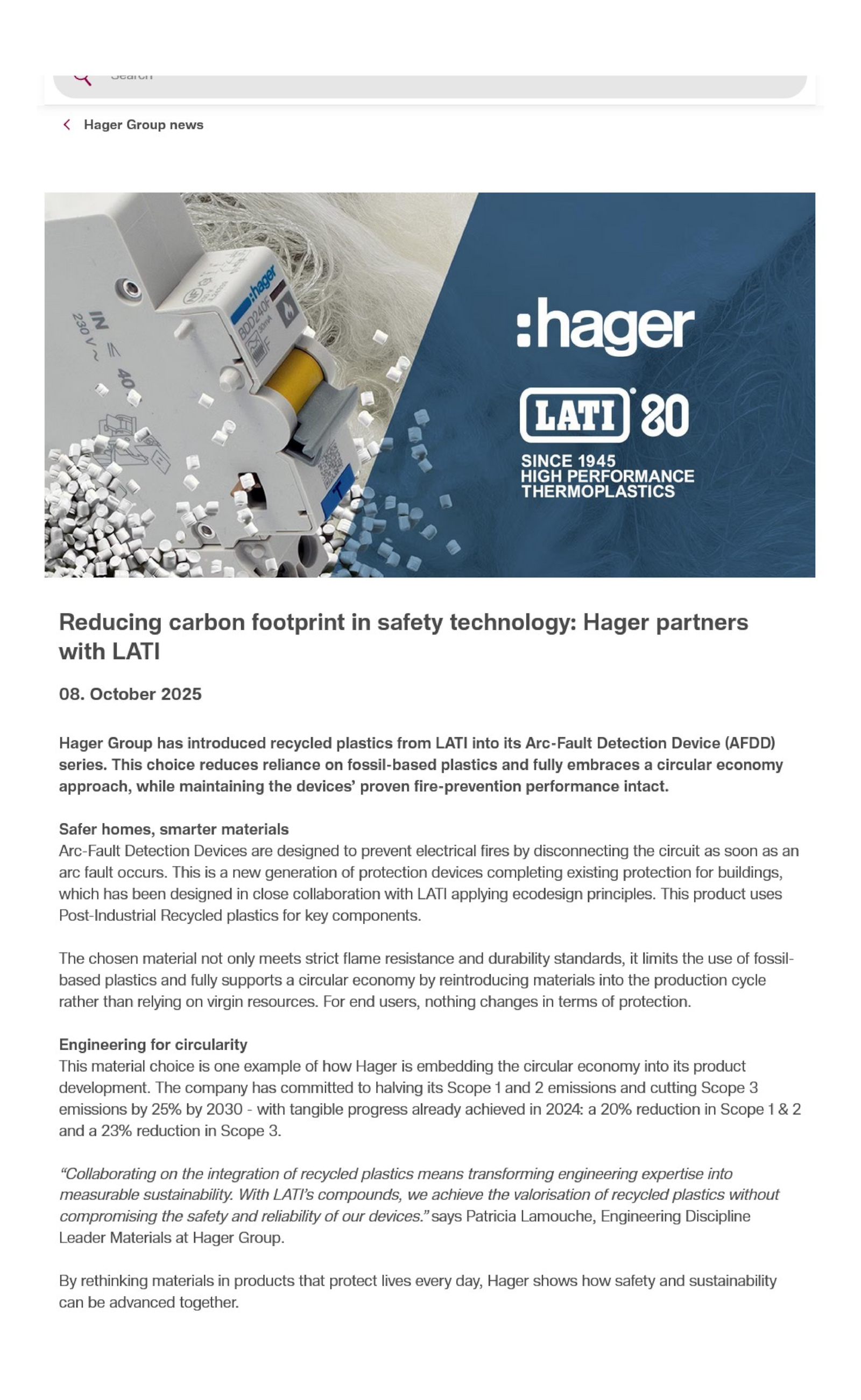 Hager Group has introduced recycled plastics from LATI into its Arc-Fault Detection Device (AFDD)