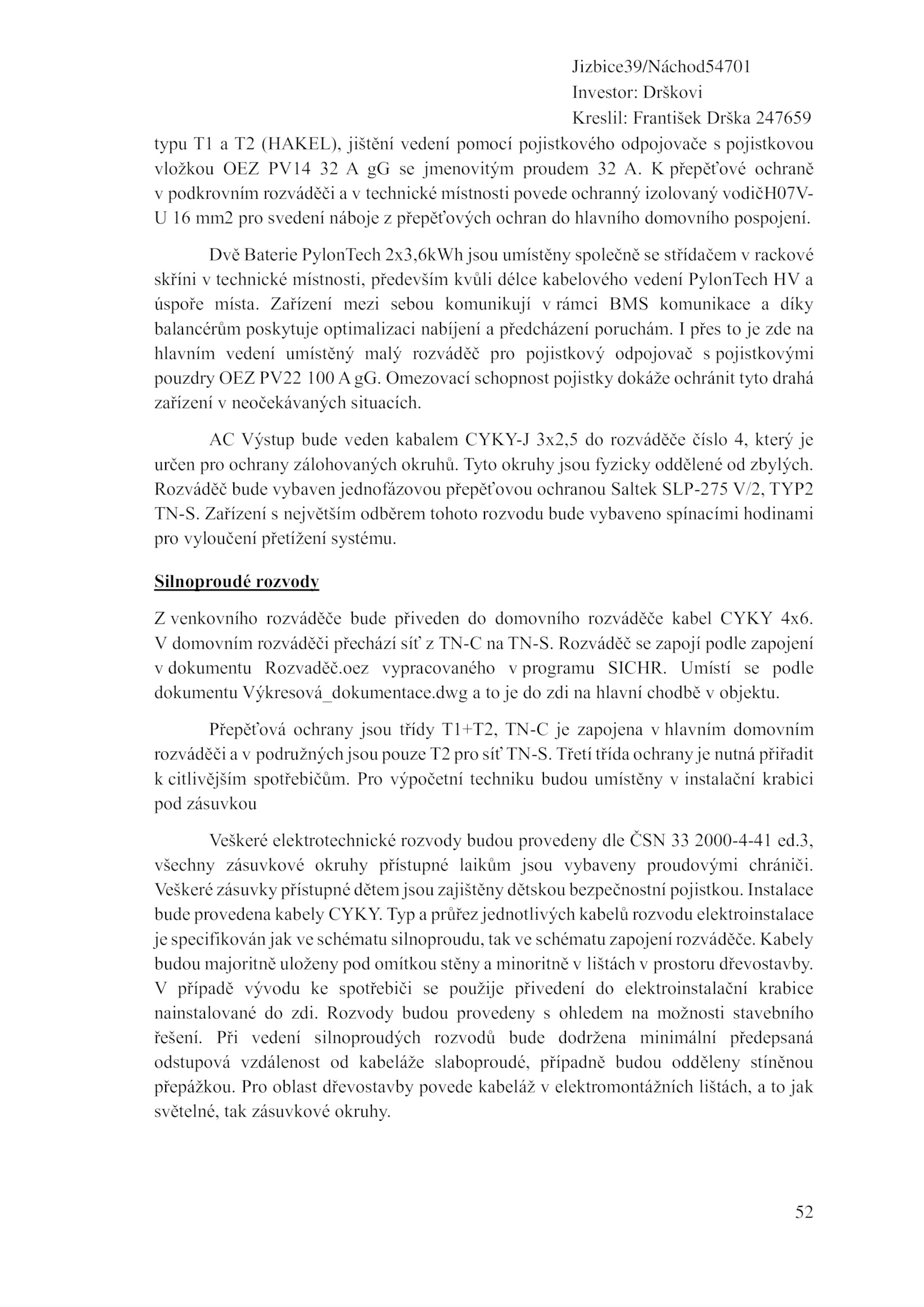 všechny zásuvkové okruhy přístupné laikům jsou vybaveny proudovými chrániči. Typ průřez jednotlivých kabelů rozvodu elektroinstalace