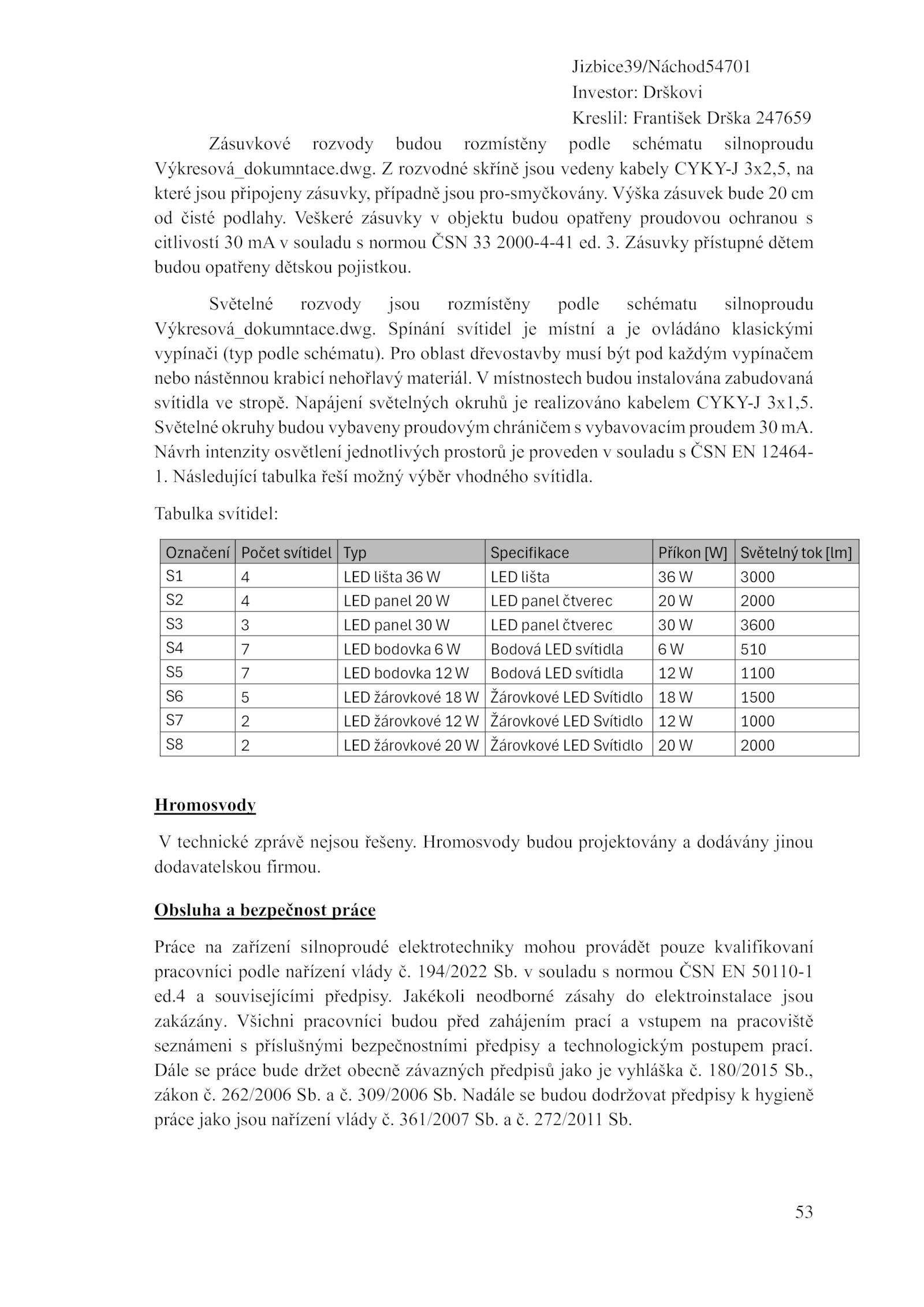 nebo nástěnnou krabicí nehořlavý materiál. Následující tabulka řeší možný výběr vhodného svítidla. Napájení světelných okruhů realizováno kabelem CYKY-J 3x1,5. Zásuvky přístupné dětem