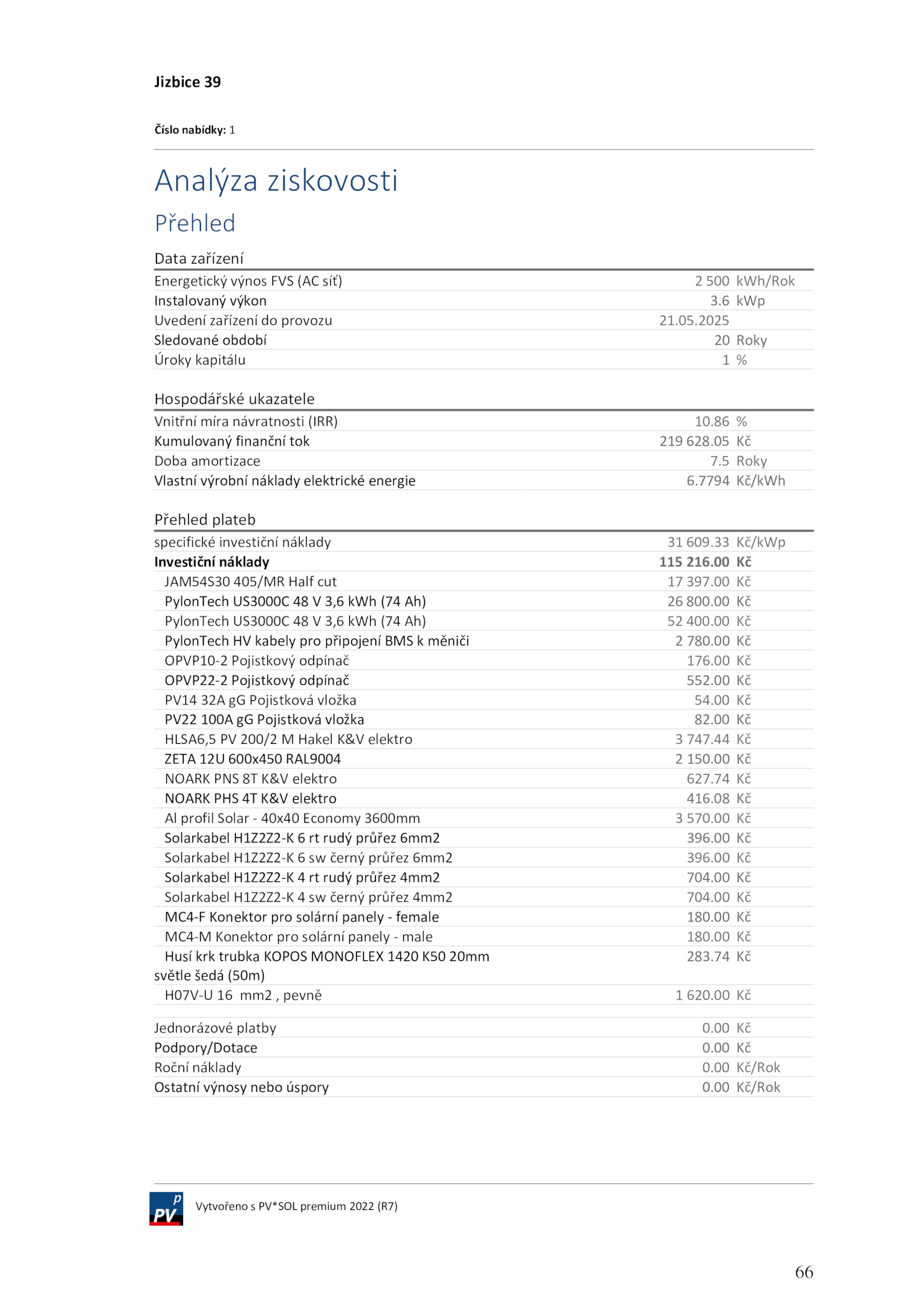 00 Kč PV22 100A Pojistková vložka 82.00 Kč PylonTech US3000C 3,6 kWh (74 Ah) 800.00 Kč OPVP10-2 Pojistkový odpínač 176.00 Kč/Rok .00 Kč NOARK PNS K&V elektro 627.00 Kč PV14 32A Pojistková vložka 54.00 Kč Solarkabel H1Z2Z2-K rudý průřez 4mm2 704.7794 Kč/kWh Přehled plateb specifické investiční náklady 609.00 Kč MC4-F Konektor pro solární panely female 180.08 Kč Al profil Solar 40x40 Economy 3600mm 570.66 Vytvořeno PV*SOL premium 2022 (R7) Číslo nabídky: 1 Jizbice 39 Analýza ziskovosti Přehled Data zařízení Energetický výnos FVS (AC síť) 500 kWh/Rok Instalovaný výkon 3.00 Kč MC4-M Konektor pro solární panely male 180.00 Kč PylonTech US3000C 3,6 kWh (74 Ah) 400.00 Kč/Rok Ostatní výnosy nebo úspory 0.44 Kč ZETA 12U 600x450 RAL9004 150.05 Kč Doba amortizace 7.74 Kč NOARK PHS K&V elektro 416.00 Kč OPVP22-2 Pojistkový odpínač 552.00 Kč HLSA6,5 200/2 Hakel K&V elektro 747.00 Kč PylonTech kabely pro připojení BMS měniči 780.6 kWp Uvedení zařízení provozu 21.00 Kč Solarkabel H1Z2Z2-K rudý průřez 6mm2 396.00 Kč Solarkabel H1Z2Z2-K černý průřez 6mm2 396.33 Kč/kWp Investiční náklady 115 216.00 Kč Solarkabel H1Z2Z2-K černý průřez 4mm2 704.5 Roky Vlastní výrobní náklady elektrické energie 6.00 Kč Roční náklady 0.00 Kč Podpory/Dotace 0.00 Kč Jednorázové platby 0.74 Kč H07V-U mm2 pevně 620.05.00 Kč JAM54S30 405/MR Half cut 397.00 Kč Husí krk trubka KOPOS MONOFLEX 1420 K50 20mm světle šedá (50m) 283.86 % Kumulovaný finanční tok 219 628.2025 Sledované období Roky Úroky kapitálu % Hospodářské ukazatele Vnitřní míra návratnosti (IRR) 10