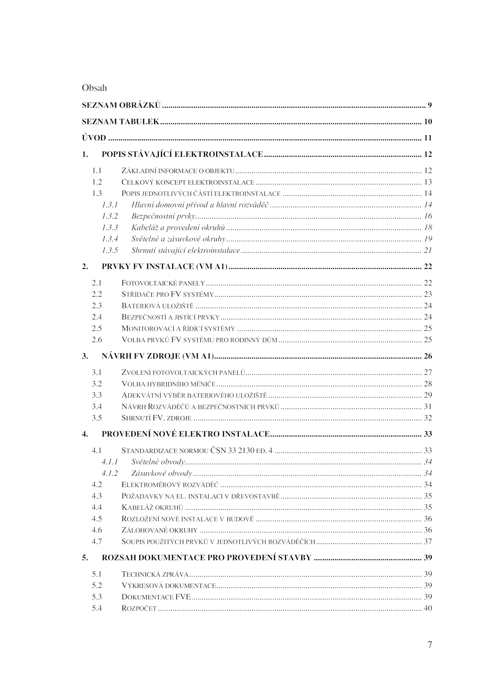 ...................... ZDROJE ......................6 VOLBA PRVKŮ SYSTÉMU PRO RODINNÝ DŮM ......5 ROZLOŽENÍ NOVÉ INSTALACE BUDOVĚ ...................3.............. 40 .................................................... 33 4........3............................................. 21 2.......................................................................................................................... 19 1.............2 Zásuvkové obvody .......4 Světelné zásuvkové okruhy...............................................................................................................................................3 POPIS JEDNOTLIVÝCH ČÁSTÍ ELEKTROINSTALACE ...................... NÁVRH ZDROJE (VM A1)............... 14 1.................................................................................................................................................................................................3 DOKUMENTACE FVE..................................... 11 1....................................................................... 29 3......................... INSTALACI DŘEVOSTAVBĚ........................................................................................................ 12 1..........................................................7 SOUPIS POUŽITÝCH PRVKŮ JEDNOTLIVÝCH ROZVÁDĚČÍCH......................................................... 36 4.................5 Shrnutí stávající elektroinstalace.......... POPIS STÁVAJÍCÍ ELEKTROINSTALACE... 24 2...................................................................................4 ROZPOČET ........................................................... 34 4................... 28 3......................................................... 35 4................................................1............................... 23 2..........2 VOLBA HYBRIDNÍHO MĚNIČE...................................4 NÁVRH ROZVÁDĚČŮ BEZPEČNOSTNÍCH PRVKŮ ................................................................................................................................................................5 SHRNUTÍ FV............... 33 4....................... ....................3......................................................3 POŽADAVKY EL........................................1 STANDARDIZACE NORMOU ČSN 2130 ED........2 STŘÍDAČE PRO SYSTÉMY.............. 35 4.. 26 3........... 16 1..........................................................................................................................................1 TECHNICKÁ ZPRÁVA...................6 ZÁLOHOVANÉ OKRUHY ............................. 32 4.............................................................................................................................................. 9 SEZNAM TABULEK............... PROVEDENÍ NOVÉ ELEKTRO INSTALACE............................................................2 ELEKTROMĚROVÝ ROZVÁDĚČ .......................................................................................................................................................5 MONITOROVACÍ ŘÍDÍCÍ SYSTÉMY ..................................................................3.........................3 Kabeláž provedení okruhů ........3 ADEKVÁTNÍ VÝBĚR BATERIOVÉHO ULOŽIŠTĚ ........................4 KABELÁŽ OKRUHŮ .......................................... 25 3........................................................................... ROZSAH DOKUMENTACE PRO PROVEDENÍ STAVBY ............................................................. 39 5................................................................................................................................................ 10 ÚVOD ................1.................2 CELKOVÝ KONCEPT ELEKTROINSTALACE ...7 Obsah SEZNAM OBRÁZKŮ ........2 VÝKRESOVÁ DOKUMENTACE.................................. 24 2..... 22 2............. 34 4....... 31 3................................1 ZÁKLADNÍ INFORMACE OBJEKTU................................................... 34 4........................... PRVKY INSTALACE (VM A1)..................................1 FOTOVOLTAICKÉ PANELY.............4 BEZPEČNOSTÍ JISTÍCÍ PRVKY................................................................................. 12 1....3 BATERIOVÁ ULOŽIŠTĚ ..................................................................................3.................. 22 2......................... 39 5...... 39 5.......................................... 18 1.............................1 ZVOLENÍ FOTOVOLTAICKÝCH PANELŮ....................... 27 3............................................................... 13 1...................... 39 5.1 Světelné obvody... 36 4. 25 2...................................................................1 Hlavní domovní přívod hlavní rozváděč ........................................................................................................................................................... 37 5.............................................2 Bezpečnostní prvky................................................. 14 1.......................................................
