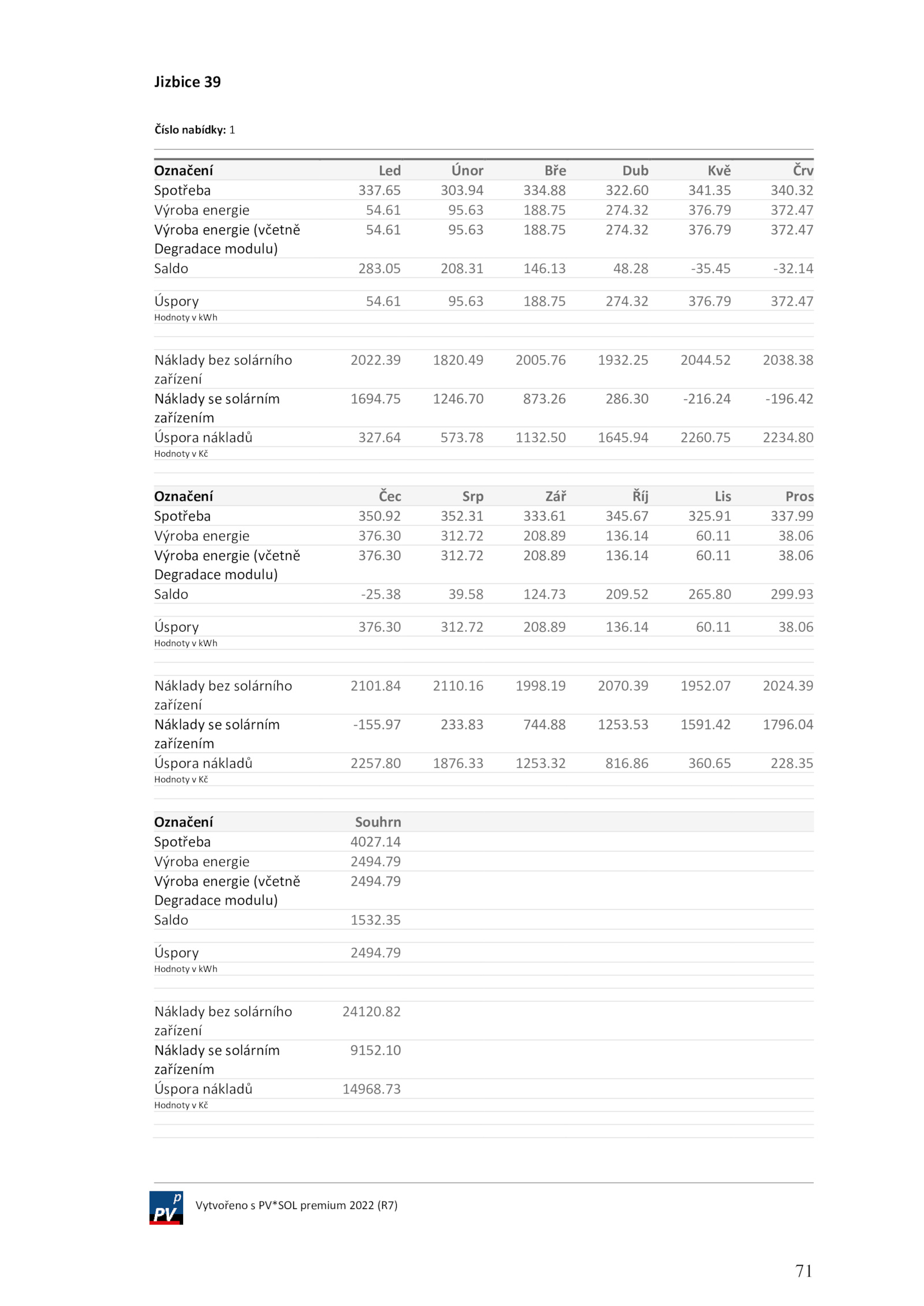 42 Úspora nákladů 327.24 -196.35 340.70 873.79 372.30 312.31 146.14 60.71 Vytvořeno PV*SOL premium 2022 (R7) Číslo nabídky: 1 Jizbice 39 Označení Led Únor Bře Dub Kvě Črv Spotřeba 337.79 372.06 Saldo -25.30 -216.75 274.79 372.39 1952.11 38.94 2260.82 Náklady solárním zařízením 9152.88 1253.32 376.97 233.75 2234.39 Náklady solárním zařízením -155.73 209.06 Výroba energie (včetně Degradace modulu) 376.14 60.38 Náklady solárním zařízením 1694.65 228.65 303.89 136.53 1591.61 95.45 -32.39 1820.52 2038.61 95.06 Hodnoty kWh Náklady bez solárního zařízení 2101.16 1998.04 Úspora nákladů 2257.63 188.32 816.60 341.99 Výroba energie 376.32 376.11 38.91 337.63 188.28 -35.10 Úspora nákladů 14968.07 2024.58 124.84 2110.92 352.47 Saldo 283.72 208.75 274.80 Hodnoty Kč Označení Čec Srp Zář Říj Lis Pros Spotřeba 350.47 Hodnoty kWh Náklady bez solárního zařízení 2022.94 334.67 325.31 333.89 136.72 208.78 1132.30 312.47 Výroba energie (včetně Degradace modulu) 54.33 1253.86 360.52 265.93 Úspory 376.11 38.80 299.05 208.80 1876.26 286.89 136.42 1796.25 2044.61 95.35 Hodnoty Kč Označení Souhrn Spotřeba 4027.35 Úspory 2494.76 1932.61 345.75 1246.14 Úspory 54.72 208.75 274.64 573.79 Saldo 1532.79 Hodnoty kWh Náklady bez solárního zařízení 24120.14 Výroba energie 2494.83 744.79 Výroba energie (včetně Degradace modulu) 2494.73 Hodnoty Kč .32 376.49 2005.13 48.30 312.19 2070.38 39.50 1645.63 188.32 Výroba energie 54.88 322.14 60
