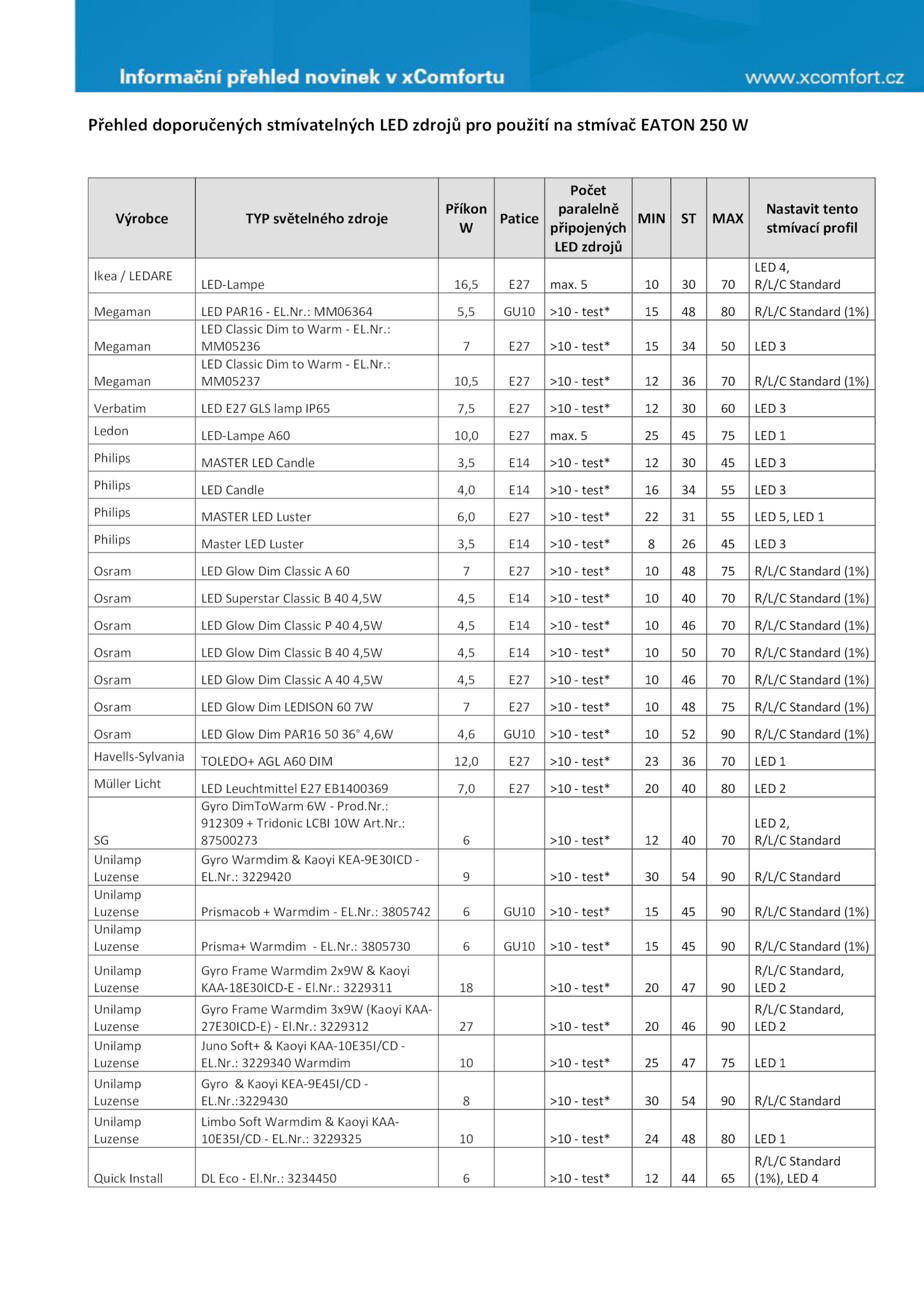 Megaman LED PAR16 EL.Nr.Přehled doporučených stmívatelných LED zdrojů pro použití stmívač EATON 250 W