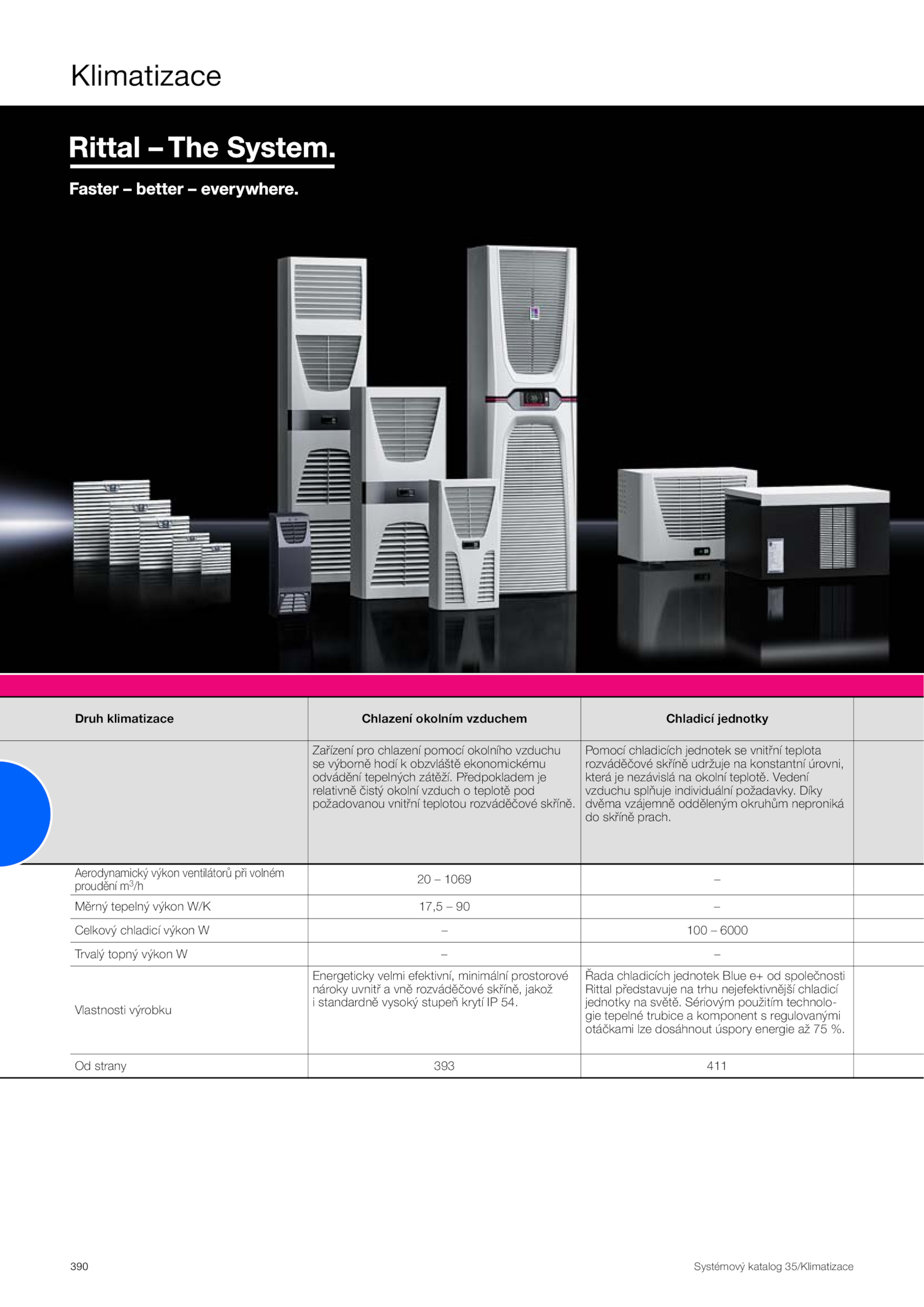 Od strany 393 411 .Klimatizace 390 Systémový katalog 35/Klimatizace Druh klimatizace Chlazení okolním vzduchem Chladicí jednotky Zařízení pro chlazení pomocí okolního vzduchu se výborně hodí obzvláště ekonomickému odvádění tepelných zátěží. Vedení vzduchu splňuje individuální požadavky. Řada chladicích jednotek Blue společnosti Rittal představuje trhu nejefektivnější chladicí jednotky světě. Předpokladem je relativně čistý okolní vzduch teplotě pod požadovanou vnitřní teplotou rozváděčové skříně. Pomocí chladicích jednotek vnitřní teplota rozváděčové skříně udržuje konstantní úrovni, která nezávislá okolní teplotě. Sériovým použitím technolo- gie tepelné trubice komponent regulovanými otáčkami lze dosáhnout úspory energie %. Aerodynamický výkon ventilátorů při volném proudění m3/h 20 1069 – Měrný tepelný výkon W/K 17,5 – Celkový chladicí výkon 100 6000 Trvalý topný výkon – Vlastnosti výrobku Energeticky velmi efektivní, minimální prostorové nároky uvnitř vně rozváděčové skříně, jakož i standardně vysoký stupeň krytí 54. Díky dvěma vzájemně odděleným okruhům neproniká do skříně prach