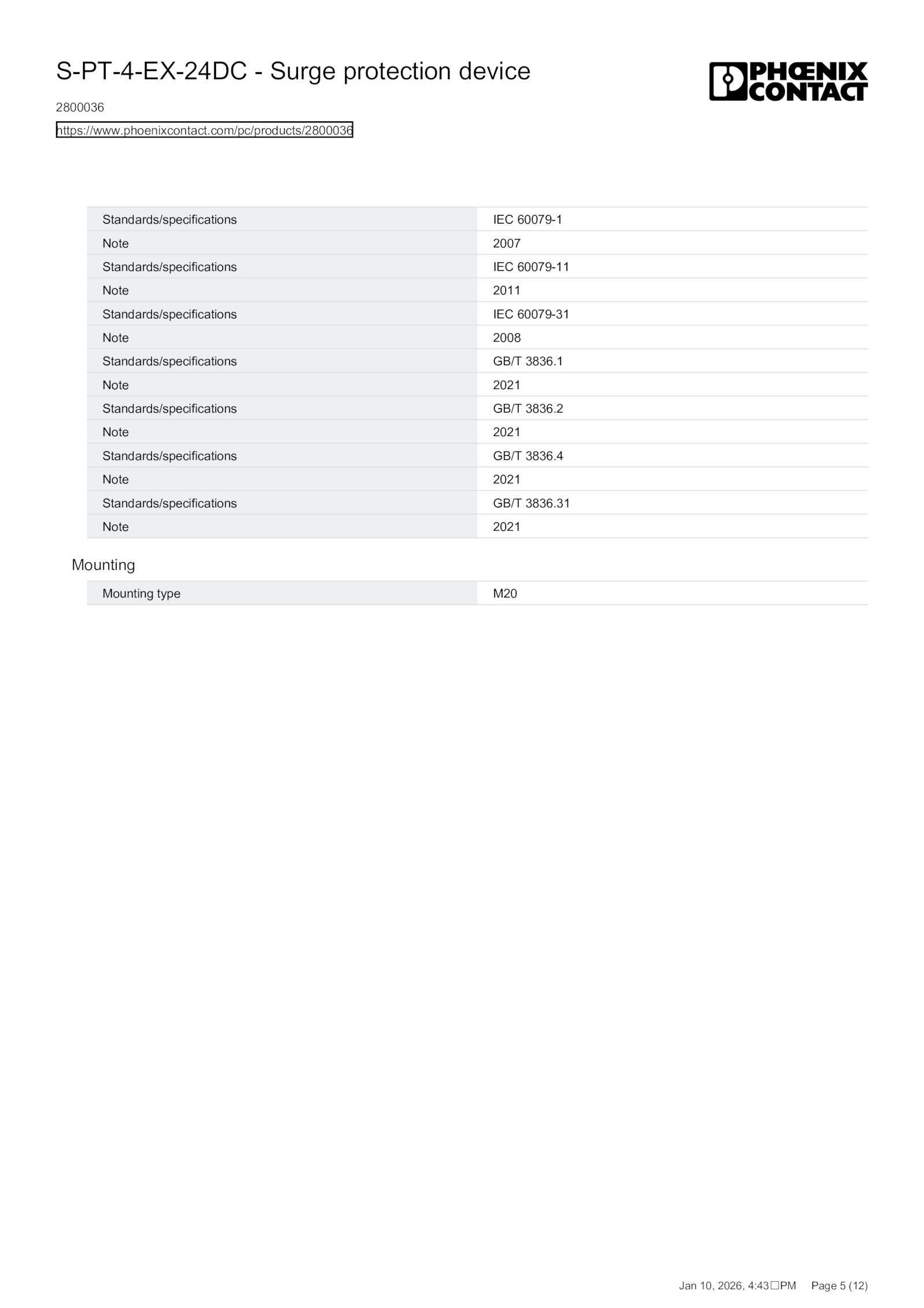 4 Note 2021 Standards/specifications GB/T 3836.phoenixcontact.31 Note 2021 Mounting Mounting type M20 S-PT-4-EX-24DC Surge protection device 2800036 https://www.2 Note 2021 Standards/specifications GB/T 3836.1 Note 2021 Standards/specifications GB/T 3836.com/pc/products/2800036 Jan 10, 2026, 4:43 Page (12) .Standards/specifications IEC 60079-1 Note 2007 Standards/specifications IEC 60079-11 Note 2011 Standards/specifications IEC 60079-31 Note 2008 Standards/specifications GB/T 3836