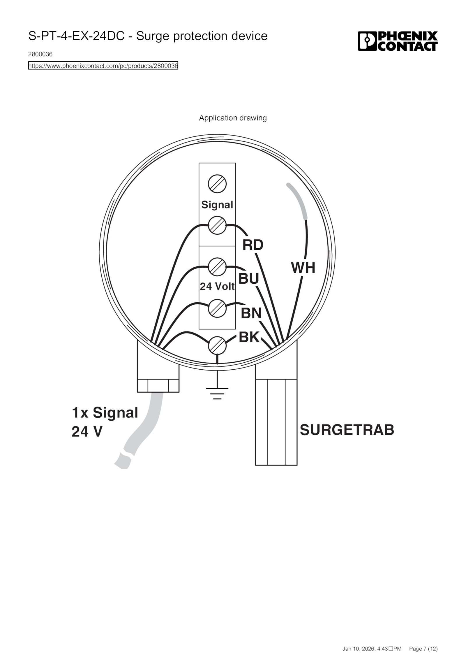 com/pc/products/2800036 Jan 10, 2026, 4:43 Page (12) .Application drawing SURGETRAB 1x Signal 24 V 24 Volt Signal BU RD WH BN BK S-PT-4-EX-24DC Surge protection device 2800036 https://www.phoenixcontact