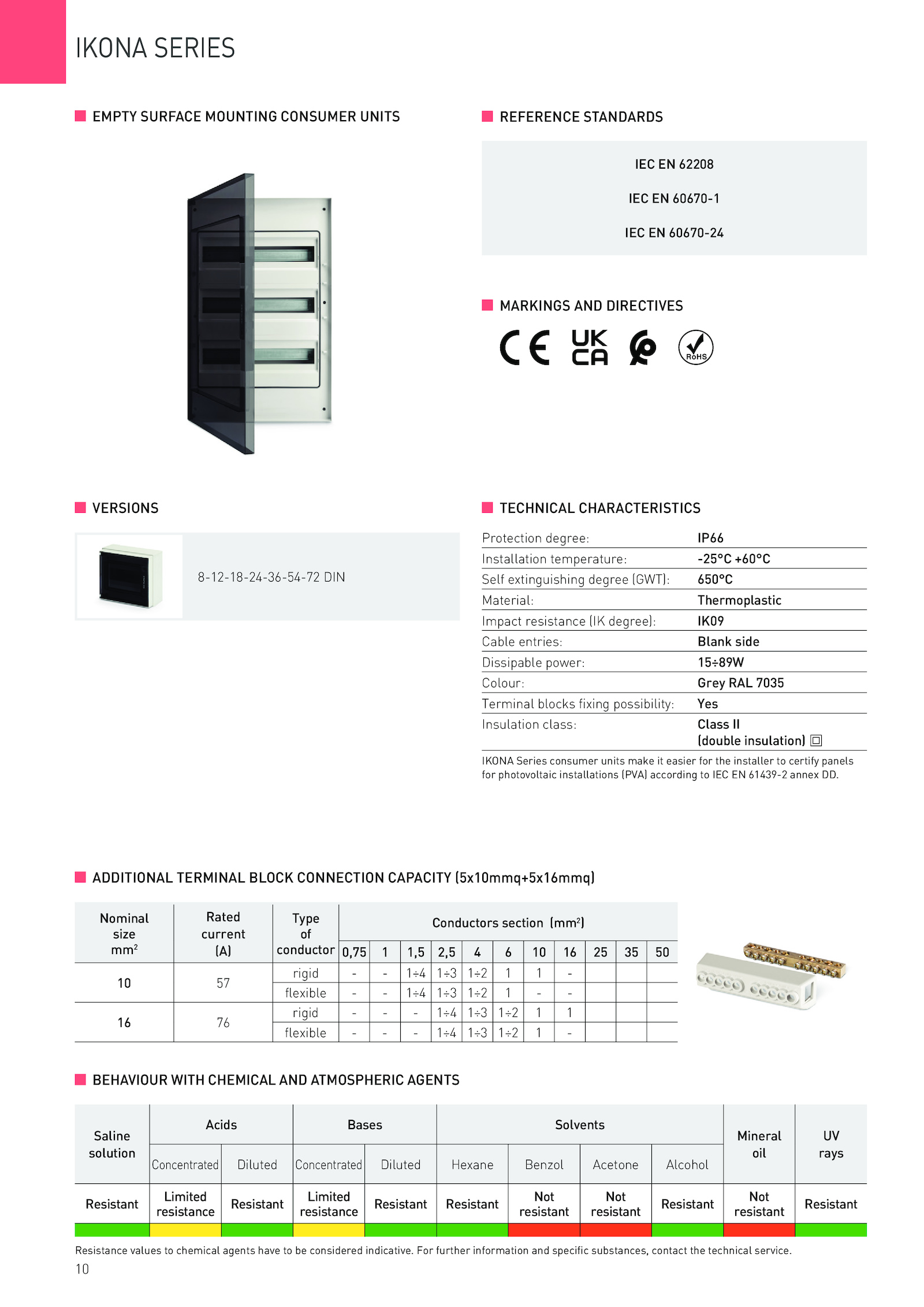 For further information and specific substances, contact the technical service. Saline solution Acids Bases Solvents Mineral oil UV rays Concentrated Diluted Concentrated Diluted Hexane Benzol Acetone Alcohol Resistant Limited resistance Resistant Limited resistance Resistant Resistant Not resistant Not resistant Resistant Not resistant Resistant BEHAVIOUR WITH CHEMICAL AND ATMOSPHERIC AGENTS Resistance values chemical agents have considered indicative.IKONA Series consumer units make easier for the installer certify panels for photovoltaic installations (PVA) according IEC 61439-2 annex DD. 10 IKONA SERIES IEC 62208 IEC 60670-1 IEC 60670-24 EMPTY SURFACE MOUNTING CONSUMER UNITS 8-12-18-24-36-54-72 DIN VERSIONS REFERENCE STANDARDS ADDITIONAL TERMINAL BLOCK CONNECTION CAPACITY (5x10mmq+5x16mmq) Nominal size mm2 Rated current (A) Type of conductor Conductors section (mm2 ) 0,75 1,5 2,5 50 10 57 rigid 1÷4 1÷3 1÷2 - flexible 1÷4 1÷3 1÷2 - 16 76 rigid 1÷4 1÷3 1÷2 1 flexible 1÷4 1÷3 1÷2 - MARKINGS AND DIRECTIVES ã è Protection degree: IP66 Installation temperature: -25°C +60°C Self extinguishing degree (GWT): 650°C Material: Thermoplastic Impact resistance (IK degree): IK09 Cable entries: Blank side Dissipable power: 15÷89W Colour: Grey RAL 7035 Terminal blocks fixing possibility: Yes Insulation class: Class II (double insulation) e TECHNICAL CHARACTERISTICS