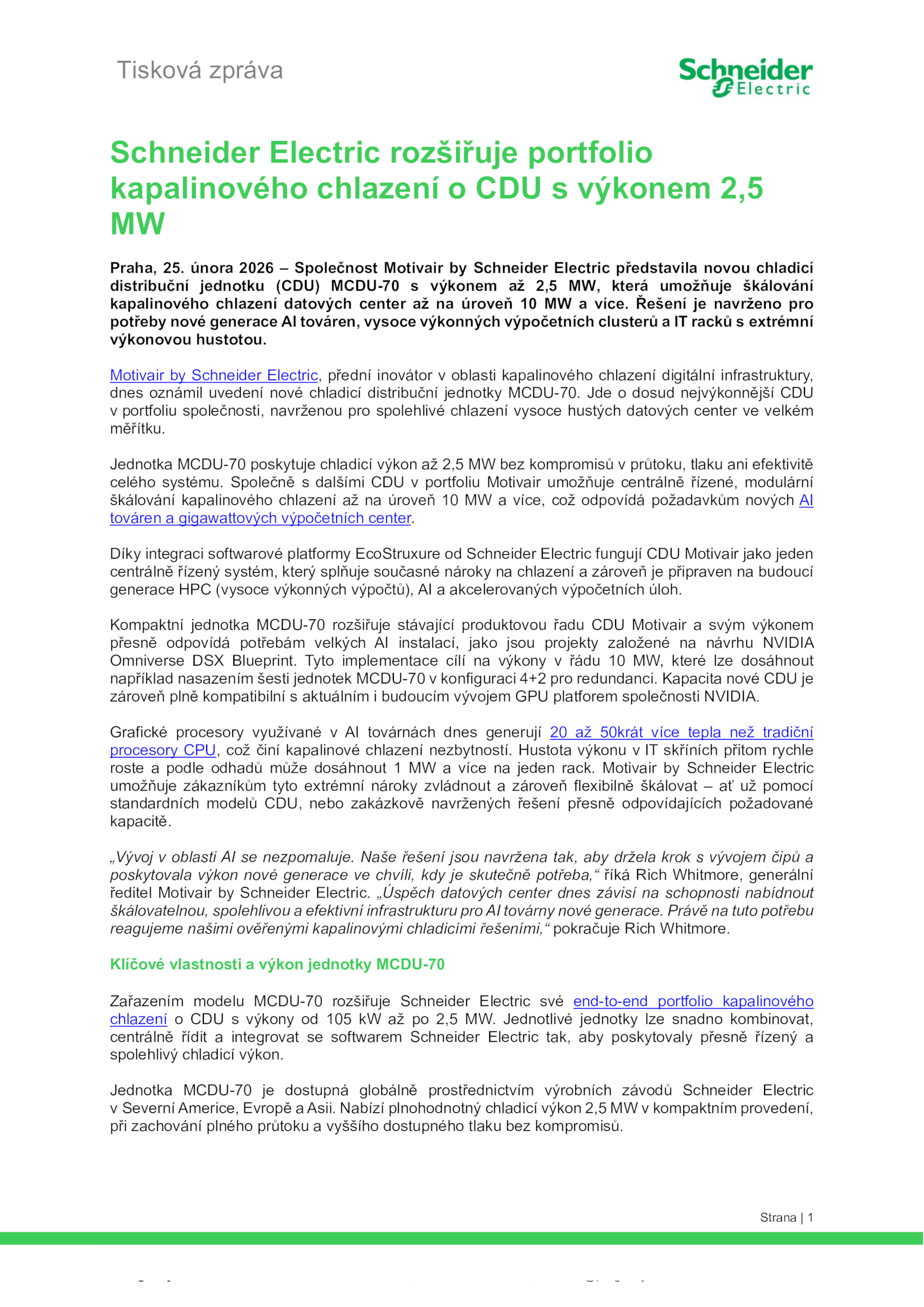 dnes oznámil uvedení nové chladicí distribuční jednotky MCDU-70. února 2026 Společnost Motivair Schneider Electric představila novou chladicí