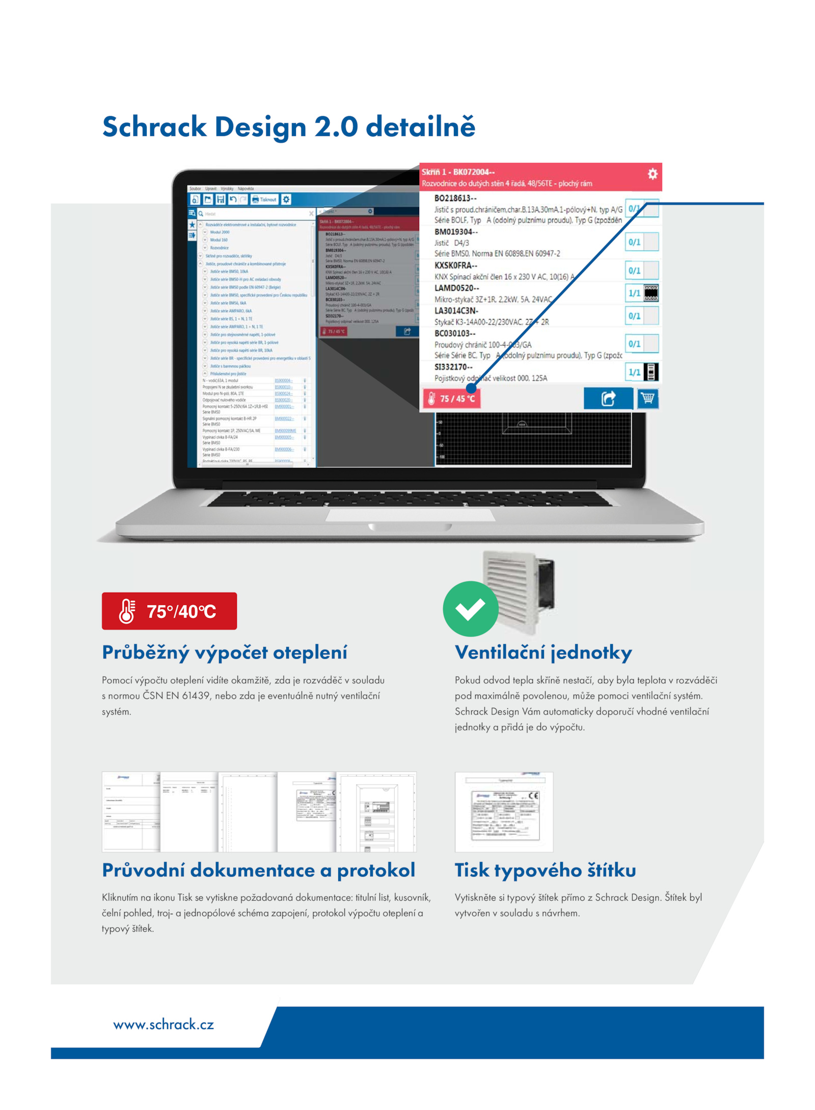 Schrack Design je softwarový nástroj, který pomůže snadno a spolehlivě navrhnout elektrickérozvaděče nízkého napětí podle aktuálních norem ČSN EN 61439-1, -2, -3 a IEC 890+A1. Součástí programu je rozsáhlá produktová databáze komponentů Schrack Technik (jističe, chrániče, skříně pro rozvaděče,…), která je pravidelně aktualizovaná. Nově je možné přidávat i ventilační jednotky, kdy výpočet zohledňuje jejich vliv na vnitřní oteplení rozvaděče.