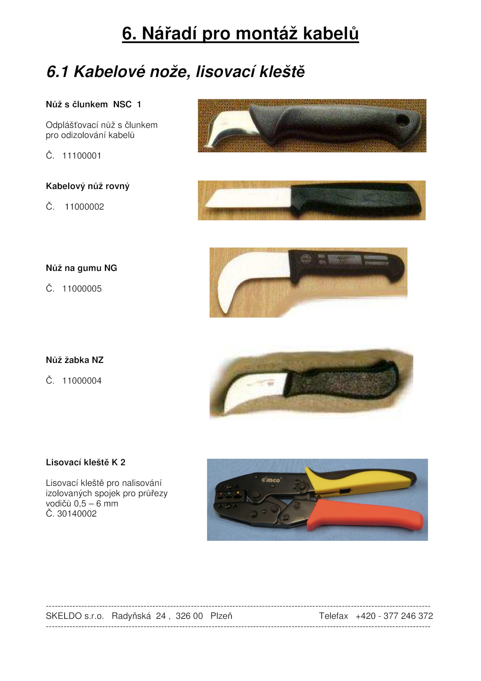 Nářadí pro montáž kabelů 6. Radyňská 326 Plzeň Telefax +420 377 246 372 ---------------------------------------------------------------------------------------------------------------------------------- .1 Kabelové nože, lisovací kleště Nůž člunkem NSC 1 Odplášťovací nůž člunkem pro odizolování kabelů Č. 11000005 Nůž žabka NZ Č. 11000002 Nůž gumu NG Č. 30140002 ---------------------------------------------------------------------------------------------------------------------------------- SKELDO s.o. 11000004 Lisovací kleště 2 Lisovací kleště pro nalisování izolovaných spojek pro průřezy vodičů 0,5 mm Č.r. 11100001 Kabelový nůž rovný Č