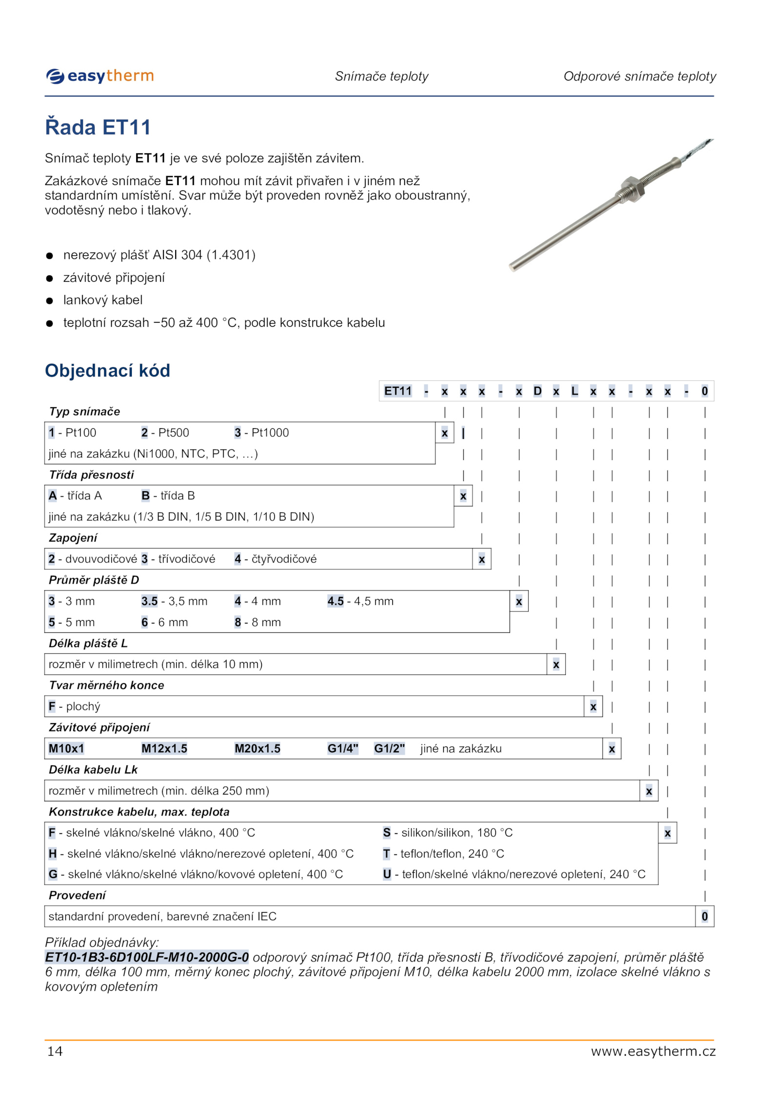 Snímač teploty ET11 své poloze zajištěn závitem. délka 250 mm) |