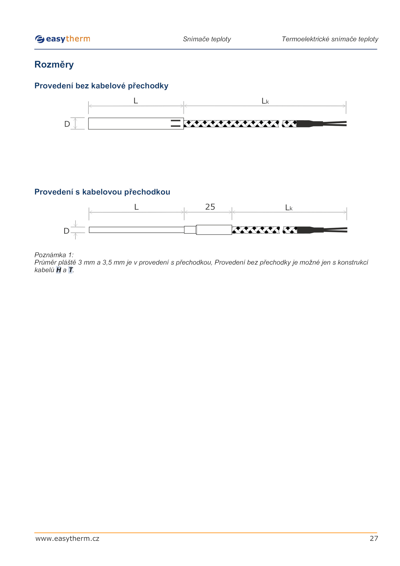 easytherm. www.Snímače teploty Termoelektrické snímače teploty Rozměry Provedení bez kabelové přechodky Provedení kabelovou přechodkou Poznámka 1: Průměr pláště 3,5 provedení přechodkou, Provedení bez přechodky možné jen konstrukcí kabelů T.cz 27