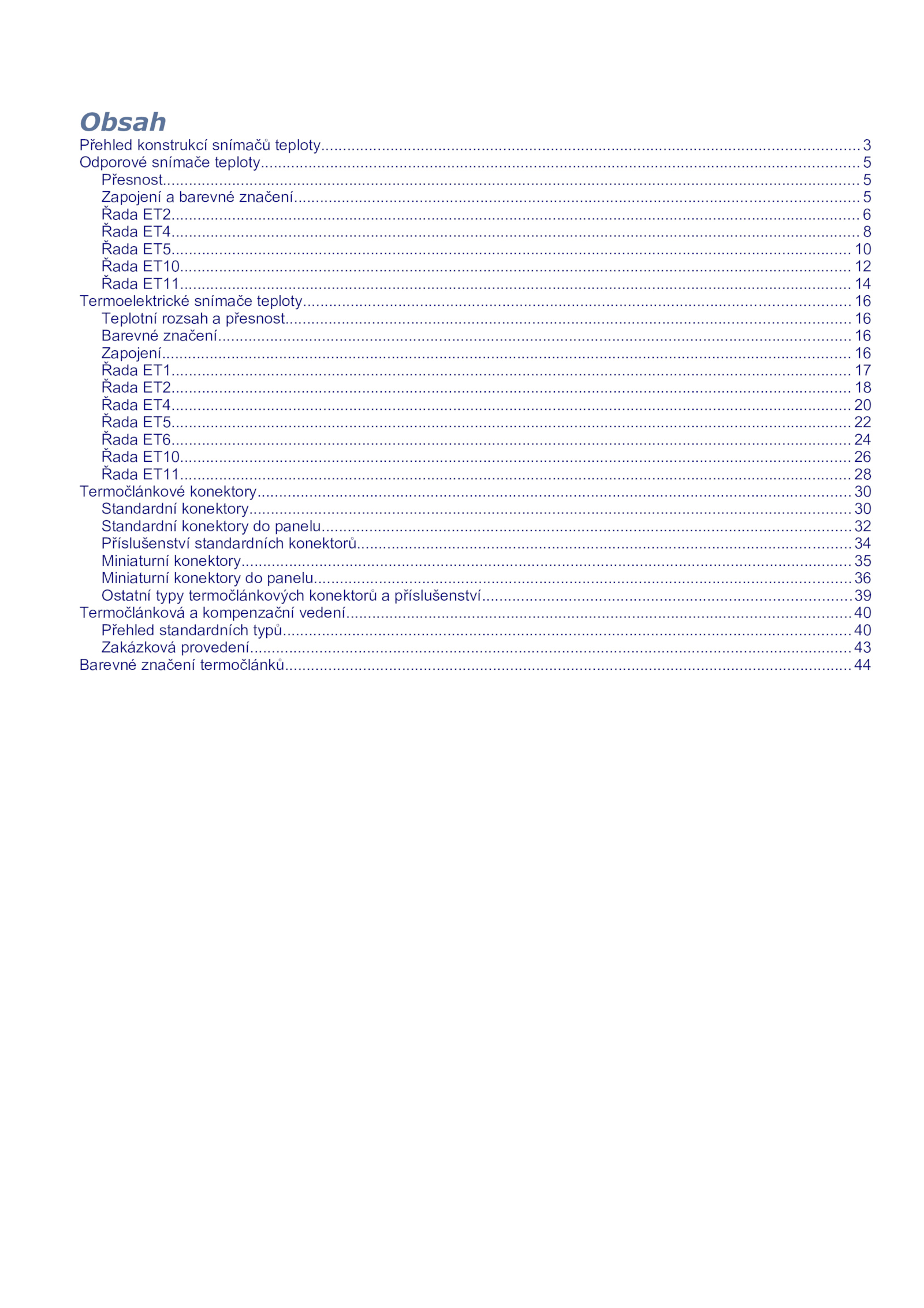 ..................................................................................................................................................................................................................................................................................................................................Obsah Přehled konstrukcí snímačů teploty....................................................................................................................................................36 Ostatní typy termočlánkových konektorů příslušenství...................................................................................................................................................................30 Standardní konektory........................................................................................................................................................................... 17 Řada ET2........................................................................................................................................................................................................................................................................................................................................................16 Barevné značení...................30 Standardní konektory panelu..............................................................................................................................................................................................................................................................................................................................................................................................................................................................................................................................................................40 Zakázková provedení....................................................................................................................44 ..............................................................................................34 Miniaturní konektory....... 16 Řada ET1....16 Zapojení............................................... 14 Termoelektrické snímače teploty.................................................................................................................................................................................. 10 Řada ET10.................................................................................................................................. 26 Řada ET11............................................... 18 Řada ET4...............16 Teplotní rozsah přesnost............................................................................................................................................................................................... 24 Řada ET10.........................................39 Termočlánková kompenzační vedení....................................................................................................................................................................... 20 Řada ET5........................................................................................................................................................................................................................................................................35 Miniaturní konektory panelu.... 22 Řada ET6.............................................................5 Řada ET2............................ 5 Zapojení barevné značení.......................................................................................................................................................................................................................................................................................................................................................................................................................................................................... 5 Přesnost................................................. 28 Termočlánkové konektory............................................................................................40 Přehled standardních typů...............................................................................43 Barevné značení termočlánků................................................................................................................................................ 6 Řada ET4..............................................................................3 Odporové snímače teploty............................................................................................ 8 Řada ET5............................................................................................................................................................................................................... 12 Řada ET11.................................................................32 Příslušenství standardních konektorů......