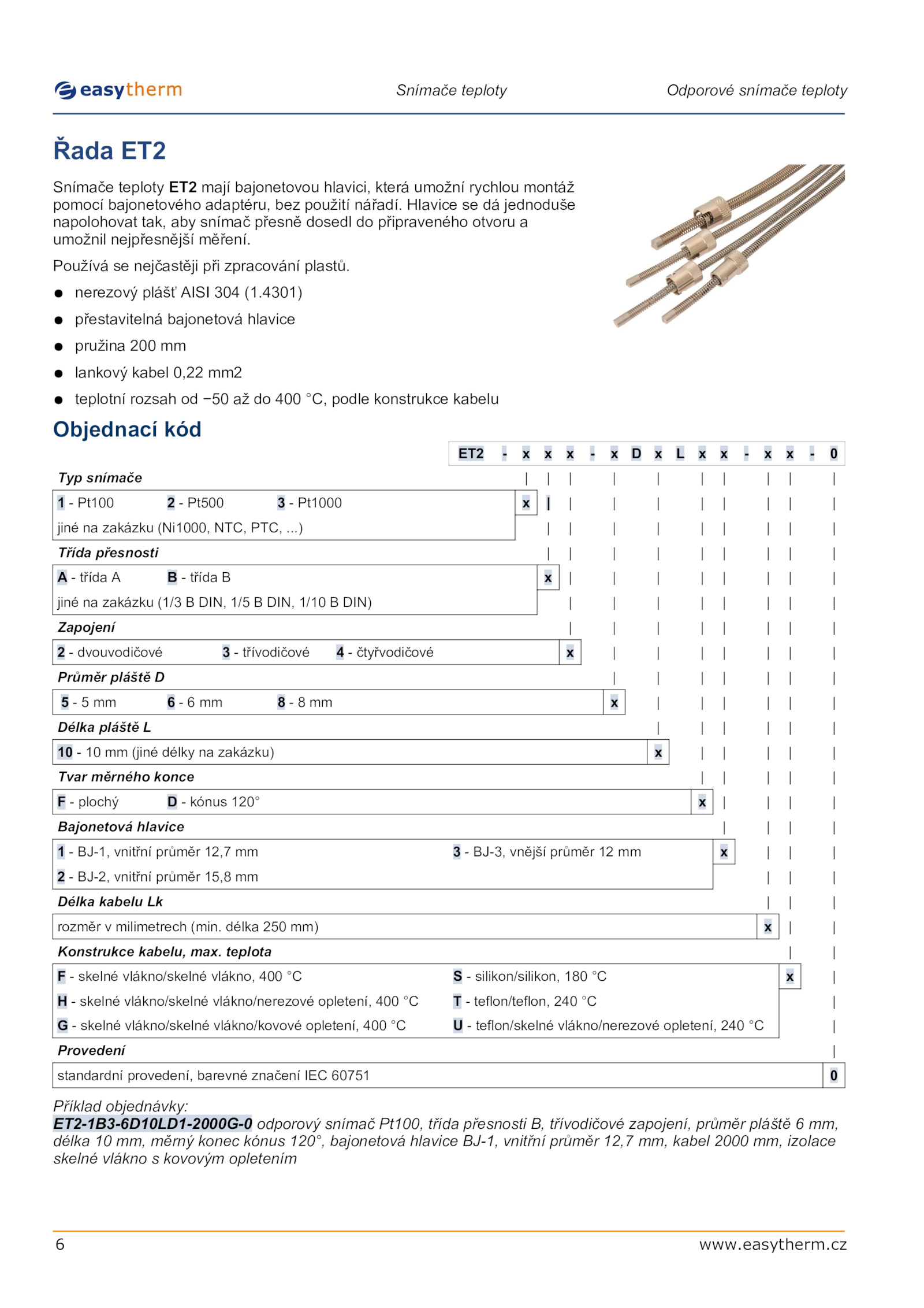 ET2-1B3-6D10LD1-2000G-0 odporový snímač Pt100, třída přesnosti třívodičové zapojení, průměr pláště mm,