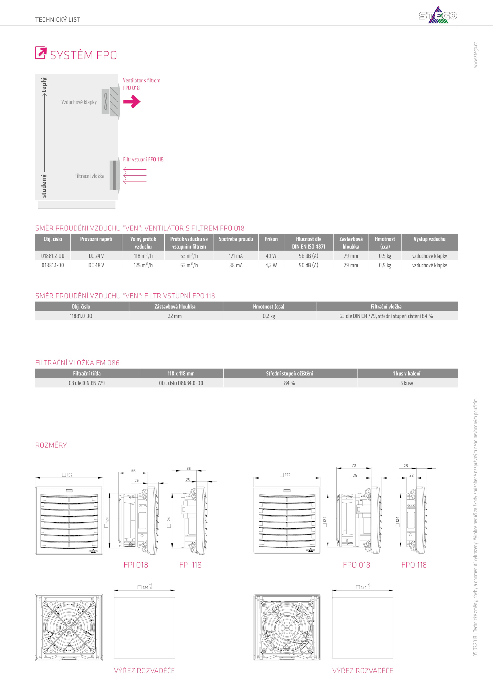 1-00 125 m³/h m³/h 4,2 (A) 0,5 vzduchové klapky SMĚR PROUDĚNÍ VZDUCHU "VEN": FILTR VSTUPNÍ FPO 118 Obj.2018 | Technické změny, chyby a opomenutí vyhrazeny. www.2-00 118 m³/h m³/h 171 4,1 (A) 0,5 vzduchové klapky 01881. Výrobce neručí za škody způsobené nesprávným nebo nevhodným použitím. číslo 08634.07.0-00 kusy SMĚR PROUDĚNÍ VZDUCHU "VEN": VENTILÁTOR FILTREM FPO 018 Obj.cz .0-30 0,2 dle DIN 779, střední stupeň čištění % ROZMĚRY teplý studený Ventilátor filtrem FPO 018 Filtr vstupní FPO 118 Vzduchové klapky Filtrační vložka SYSTÉM FPO VÝŘEZ ROZVADĚČE VÝŘEZ ROZVADĚČE TECHNICKÝ LIST 05.stego.59 FPI 118 FPI 018 FPO 118 FPO 018 25 124 152 66 35 25 124 25 124 152 66 35 25 124 25 124 152 66 35 25 124 152 79 25 124 124 25 22 152 79 25 124 124 25 22 152 79 25 124 124 25 22 124 +1 0 124 +1 0 STEGO KATALOG PRODUKTŮ CHLAZENÍ FILTRAČNÍ VLOŽKA 086 Filtrační třída 118 118 Střední stupeň očištění kus balení G3 dle DIN 779 Obj. číslo Provozní napětí Volný průtok vzduchu Průtok vzduchu se vstupním filtrem Spotřeba proudu Příkon Hlučnost dle DIN ISO 4871 Zástavbová hloubka Hmotnost (cca) Výstup vzduchu 01881. číslo Zástavbová hloubka Hmotnost (cca) Filtrační vložka 11881
