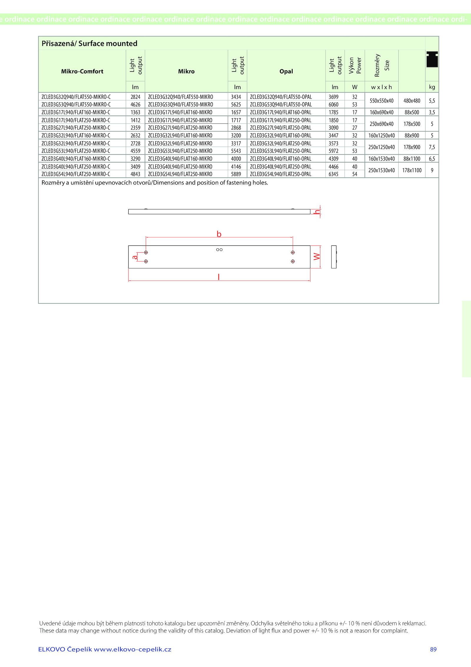 ELKOVO Čepelík www.elkovo-cepelik. These data may change without notice during the validity this catalog.cz 89 Uvedené údaje mohou být během platnosti tohoto katalogu bez upozornění změněny. Deviation light flux and power +/- not reason for complaint. Odchylka světelného toku příkonu +/- není důvodem reklamaci. Přisazená/ Surface mounted Mikro-Comfort Light output Mikro Light output Opal Light output Výkon Power Rozměry Size lm kg ZCLED3G32Q940/FLAT550-MIKRO-C 2824 ZCLED3G32Q940/FLAT550-MIKRO 3434 ZCLED3G32Q940/FLAT550-OPAL 3699 32 550x550x40 480x480 5,5 ZCLED3G53Q940/FLAT550-MIKRO-C 4626 ZCLED3G53Q940/FLAT550-MIKRO 5625 ZCLED3G53Q940/FLAT550-OPAL 6060 53 ZCLED3G17L940/FLAT160-MIKRO-C 1363 ZCLED3G17L940/FLAT160-MIKRO 1657 ZCLED3G17L940/FLAT160-OPAL 1785 160x690x40 88x500 3,5 ZCLED3G17L940/FLAT250-MIKRO-C 1412 ZCLED3G17L940/FLAT250-MIKRO 1717 ZCLED3G17L940/FLAT250-OPAL 1850 17 250x690x40 178x500 5 ZCLED3G27L940/FLAT250-MIKRO-C 2359 ZCLED3G27L940/FLAT250-MIKRO 2868 ZCLED3G27L940/FLAT250-OPAL 3090 27 ZCLED3G32L940/FLAT160-MIKRO-C 2632 ZCLED3G32L940/FLAT160-MIKRO 3200 ZCLED3G32L940/FLAT160-OPAL 3447 160x1250x40 88x900 5 ZCLED3G32L940/FLAT250-MIKRO-C 2728 ZCLED3G32L940/FLAT250-MIKRO 3317 ZCLED3G32L940/FLAT250-OPAL 3573 32 250x1250x40 178x900 7,5 ZCLED3G53L940/FLAT250-MIKRO-C 4559 ZCLED3G53L940/FLAT250-MIKRO 5543 ZCLED3G53L940/FLAT250-OPAL 5972 53 ZCLED3G40L940/FLAT160-MIKRO-C 3290 ZCLED3G40L940/FLAT160-MIKRO 4000 ZCLED3G40L940/FLAT160-OPAL 4309 160x1530x40 88x1100 6,5 ZCLED3G40L940/FLAT250-MIKRO-C 3409 ZCLED3G40L940/FLAT250-MIKRO 4146 ZCLED3G40L940/FLAT250-OPAL 4466 40 250x1530x40 178x1100 9 ZCLED3G54L940/FLAT250-MIKRO-C 4843 ZCLED3G54L940/FLAT250-MIKRO 5889 ZCLED3G54L940/FLAT250-OPAL 6345 54 Rozměry umístění upevnovacích otvorů/Dimensions and position fastening holes. a h l b W e ordinace ordinace ordinace ordinace ordinace ordinace ordinace ordinace ordinace ordinace ordinace ordinace ordinace ordinace ordi-