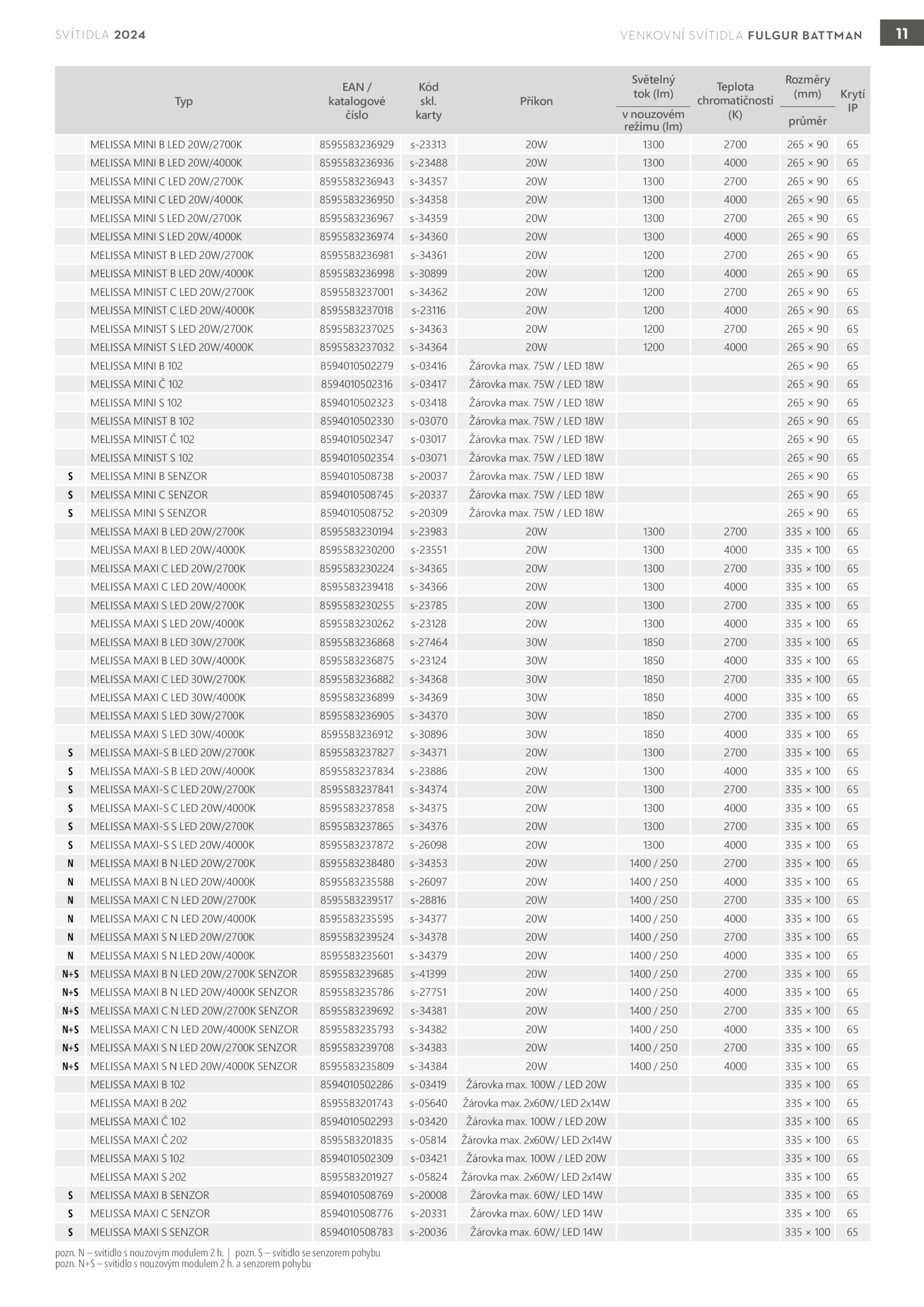 60W/ LED 14W 335 100 65 pozn. karty Příkon Světelný tok (lm) Teplota chromatičnosti (K) Rozměry (mm) Krytí IP v nouzovém režimu (lm) průměr MELISSA MINI LED 20W/2700K 8595583236929 s-23313 20W 1300 2700 265 65 MELISSA MINI LED 20W/4000K 8595583236936 s-23488 20W 1300 4000 265 65 MELISSA MINI LED 20W/2700K 8595583236943 s-34357 20W 1300 2700 265 65 MELISSA MINI LED 20W/4000K 8595583236950 s-34358 20W 1300 4000 265 65 MELISSA MINI LED 20W/2700K 8595583236967 s-34359 20W 1300 2700 265 65 MELISSA MINI LED 20W/4000K 8595583236974 s-34360 20W 1300 4000 265 65 MELISSA MINIST LED 20W/2700K 8595583236981 s-34361 20W 1200 2700 265 65 MELISSA MINIST LED 20W/4000K 8595583236998 s-30899 20W 1200 4000 265 65 MELISSA MINIST LED 20W/2700K 8595583237001 s-34362 20W 1200 2700 265 65 MELISSA MINIST LED 20W/4000K 8595583237018 s-23116 20W 1200 4000 265 65 MELISSA MINIST LED 20W/2700K 8595583237025 s-34363 20W 1200 2700 265 65 MELISSA MINIST LED 20W/4000K 8595583237032 s-34364 20W 1200 4000 265 65 MELISSA MINI 102 8594010502279 s-03416 Žárovka max. 75W LED 18W 265 65 MELISSA MAXI LED 20W/2700K 8595583230194 s-23983 20W 1300 2700 335 100 65 MELISSA MAXI LED 20W/4000K 8595583230200 s-23551 20W 1300 4000 335 100 65 MELISSA MAXI LED 20W/2700K 8595583230224 s-34365 20W 1300 2700 335 100 65 MELISSA MAXI LED 20W/4000K 8595583239418 s-34366 20W 1300 4000 335 100 65 MELISSA MAXI LED 20W/2700K 8595583230255 s-23785 20W 1300 2700 335 100 65 MELISSA MAXI LED 20W/4000K 8595583230262 s-23128 20W 1300 4000 335 100 65 MELISSA MAXI LED 30W/2700K 8595583236868 s-27464 30W 1850 2700 335 100 65 MELISSA MAXI LED 30W/4000K 8595583236875 s-23124 30W 1850 4000 335 100 65 MELISSA MAXI LED 30W/2700K 8595583236882 s-34368 30W 1850 2700 335 100 65 MELISSA MAXI LED 30W/4000K 8595583236899 s-34369 30W 1850 4000 335 100 65 MELISSA MAXI LED 30W/2700K 8595583236905 s-34370 30W 1850 2700 335 100 65 MELISSA MAXI LED 30W/4000K 8595583236912 s-30896 30W 1850 4000 335 100 65 S MELISSA MAXI-S LED 20W/2700K 8595583237827 s-34371 20W 1300 2700 335 100 65 S MELISSA MAXI-S LED 20W/4000K 8595583237834 s-23886 20W 1300 4000 335 100 65 S MELISSA MAXI-S LED 20W/2700K 8595583237841 s-34374 20W 1300 2700 335 100 65 S MELISSA MAXI-S LED 20W/4000K 8595583237858 s-34375 20W 1300 4000 335 100 65 S MELISSA MAXI-S LED 20W/2700K 8595583237865 s-34376 20W 1300 2700 335 100 65 S MELISSA MAXI-S LED 20W/4000K 8595583237872 s-26098 20W 1300 4000 335 100 65 N MELISSA MAXI LED 20W/2700K 8595583238480 s-34353 20W 1400 250 2700 335 100 65 N MELISSA MAXI LED 20W/4000K 8595583235588 s-26097 20W 1400 250 4000 335 100 65 N MELISSA MAXI LED 20W/2700K 8595583239517 s-28816 20W 1400 250 2700 335 100 65 N MELISSA MAXI LED 20W/4000K 8595583235595 s-34377 20W 1400 250 4000 335 100 65 N MELISSA MAXI LED 20W/2700K 8595583239524 s-34378 20W 1400 250 2700 335 100 65 N MELISSA MAXI LED 20W/4000K 8595583235601 s-34379 20W 1400 250 4000 335 100 65 N+S MELISSA MAXI LED 20W/2700K SENZOR 8595583239685 s-41399 20W 1400 250 2700 335 100 65 N+S MELISSA MAXI LED 20W/4000K SENZOR 8595583235786 s-27751 20W 1400 250 4000 335 100 65 N+S MELISSA MAXI LED 20W/2700K SENZOR 8595583239692 s-34381 20W 1400 250 2700 335 100 65 N+S MELISSA MAXI LED 20W/4000K SENZOR 8595583235793 s-34382 20W 1400 250 4000 335 100 65 N+S MELISSA MAXI LED 20W/2700K SENZOR 8595583239708 s-34383 20W 1400 250 2700 335 100 65 N+S MELISSA MAXI LED 20W/4000K SENZOR 8595583235809 s-34384 20W 1400 250 4000 335 100 65 MELISSA MAXI 102 8594010502286 s-03419 Žárovka max. 75W LED 18W 265 65 MELISSA MINI 102 8594010502316 s-03417 Žárovka max. 75W LED 18W 265 65 S MELISSA MINI SENZOR 8594010508738 s-20037 Žárovka max. 2x60W/ LED 2x14W 335 100 65 MELISSA MAXI 102 8594010502293 s-03420 Žárovka max. 75W LED 18W 265 65 S MELISSA MINI SENZOR 8594010508752 s-20309 Žárovka max. 2x60W/ LED 2x14W 335 100 65 MELISSA MAXI 102 8594010502309 s-03421 Žárovka max.SVÍTIDLA 2024 Typ EAN / katalogové číslo Kód skl. 100W LED 20W 335 100 65 MELISSA MAXI 202 8595583201835 s-05814 Žárovka max. 75W LED 18W 265 65 MELISSA MINI 102 8594010502323 s-03418 Žárovka max. 75W LED 18W 265 65 MELISSA MINIST 102 8594010502354 s-03071 Žárovka max. 100W LED 20W 335 100 65 MELISSA MAXI 202 8595583201927 s-05824 Žárovka max. 75W LED 18W 265 65 MELISSA MINIST 102 8594010502330 s-03070 Žárovka max. 75W LED 18W 265 65 MELISSA MINIST 102 8594010502347 s-03017 Žárovka max. svítidlo senzorem pohybu pozn. 2x60W/ LED 2x14W 335 100 65 S MELISSA MAXI SENZOR 8594010508769 s-20008 Žárovka max. 75W LED 18W 265 65 S MELISSA MINI SENZOR 8594010508745 s-20337 Žárovka max. 60W/ LED 14W 335 100 65 S MELISSA MAXI SENZOR 8594010508783 s-20036 Žárovka max. 100W LED 20W 335 100 65 MELISSA MAXI 202 8595583201743 s-05640 Žárovka max. 60W/ LED 14W 335 100 65 S MELISSA MAXI SENZOR 8594010508776 s-20331 Žárovka max. N+S svítidlo nouzovým modulem senzorem pohybu VENKOVNÍ SVÍTIDLA FULGUR BATTMAN 11 . svítidlo nouzovým modulem pozn