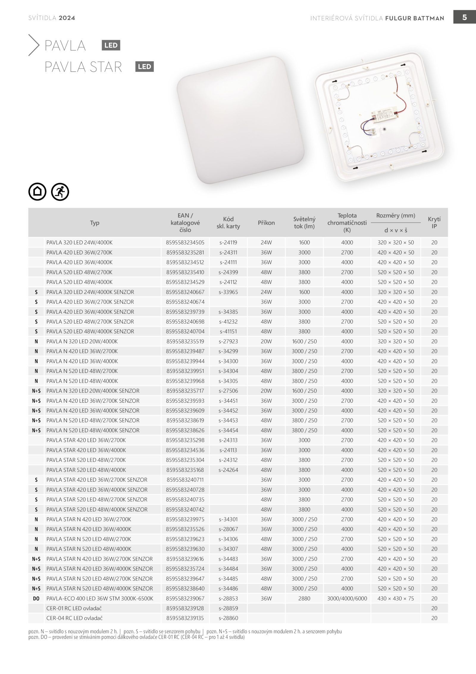 pozn. svítidlo senzorem pohybu pozn. svítidlo nouzovým modulem pozn. N+S svítidlo nouzovým modulem senzorem pohybu