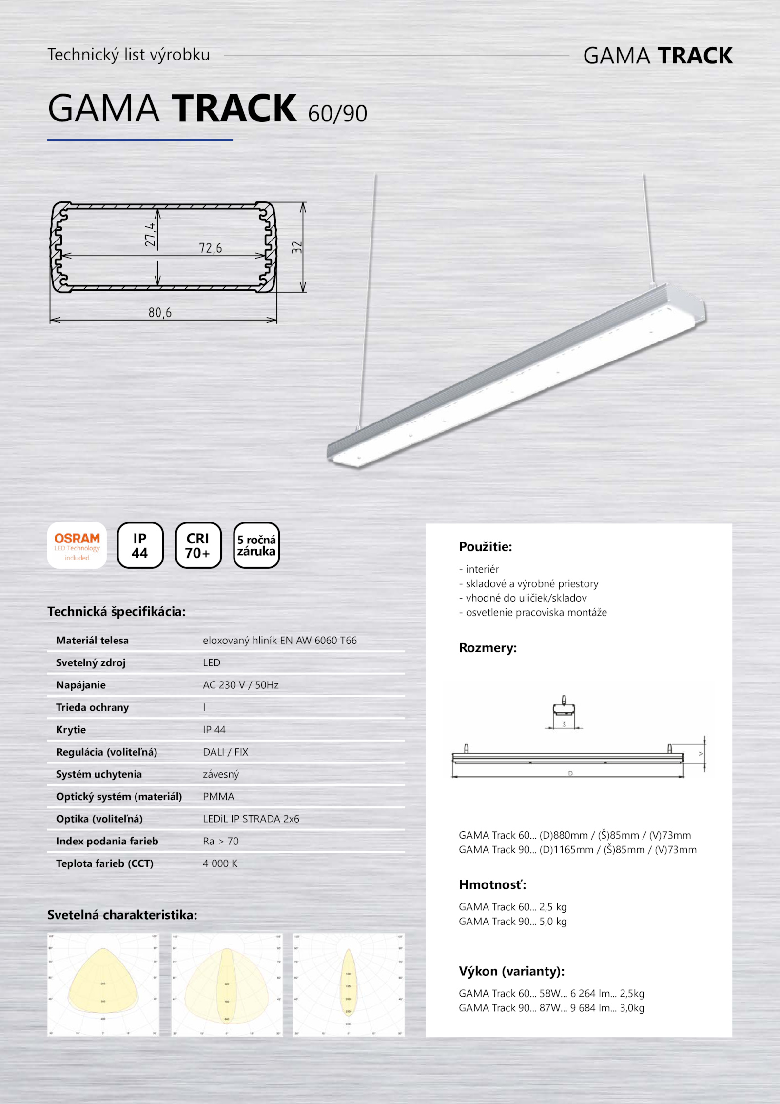 (D)880mm (Š)85mm (V)73mm GAMA Track 90...... 5,0 kg Výkon (varianty): GAMA Track 60.Technický list výrobku GAMA TRACK GAMA TRACK 60/90 Svetelná charakteristika: Použitie: - interiér - skladové výrobné priestory - vhodné uličiek/skladov - osvetlenie pracoviska montáže Rozmery: GAMA Track 60... 3,0kg Materiál telesa eloxovaný hliník 6060 T66 Svetelný zdroj LED Napájanie 230 50Hz Trieda ochrany I Krytie 44 Regulácia (voliteľná) DALI FIX Systém uchytenia závesný Optický systém (materiál) PMMA Optika (voliteľná) LEDiL STRADA 2x6 Index podania farieb 70 Teplota farieb (CCT) 000 K Technická špecifikácia: IP 44 CRI 70+ 5 ročná záruka . 2,5kg GAMA Track 90.. (D)1165mm (Š)85mm (V)73mm Hmotnosť: GAMA Track 60.. 58W. 264 lm. 87W.... 2,5 kg GAMA Track 90..... 684 lm....