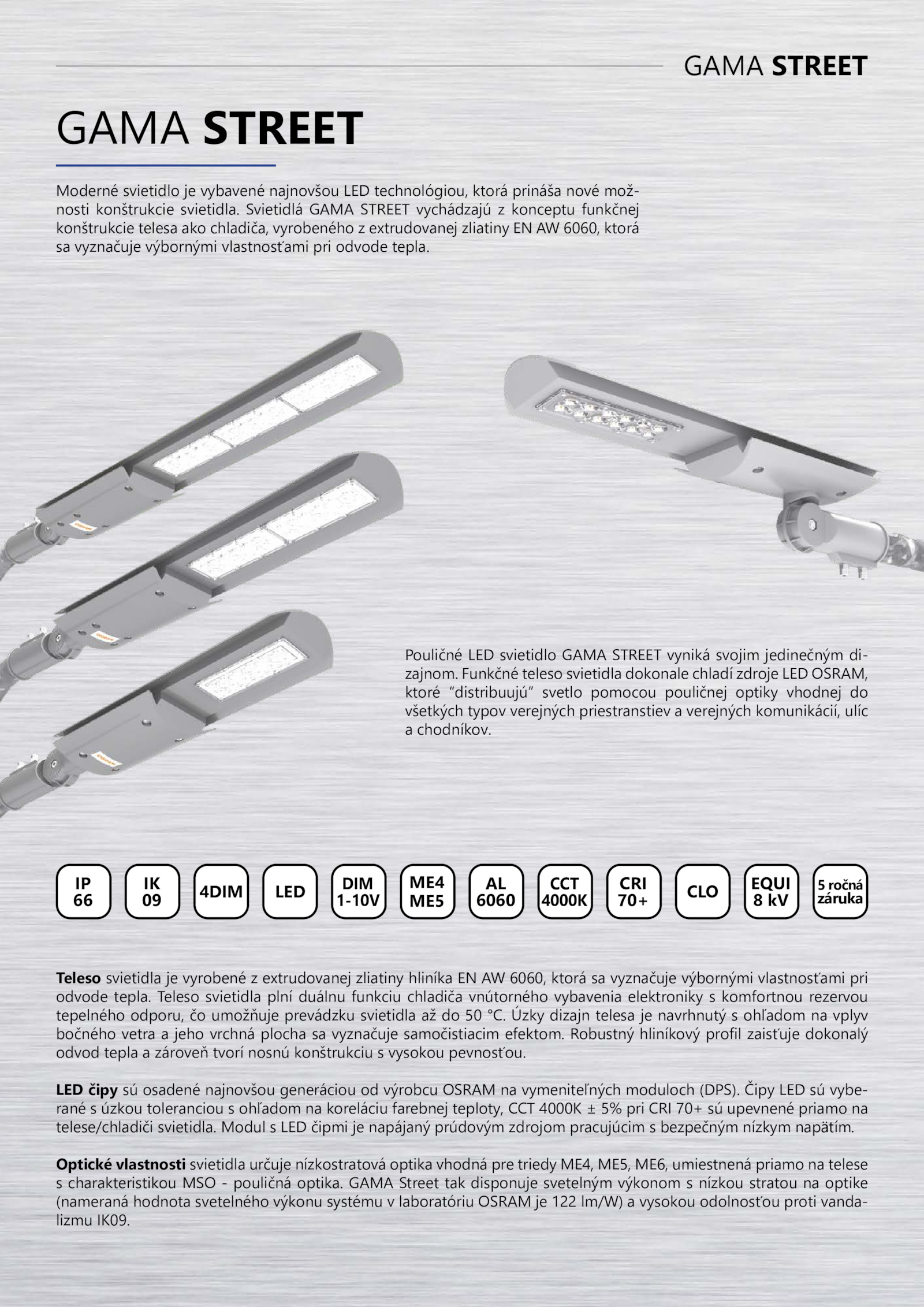 LED čipy osadené najnovšou generáciou výrobcu OSRAM vymeniteľných moduloch (DPS). GAMA Street tak disponuje svetelným výkonom nízkou stratou optike